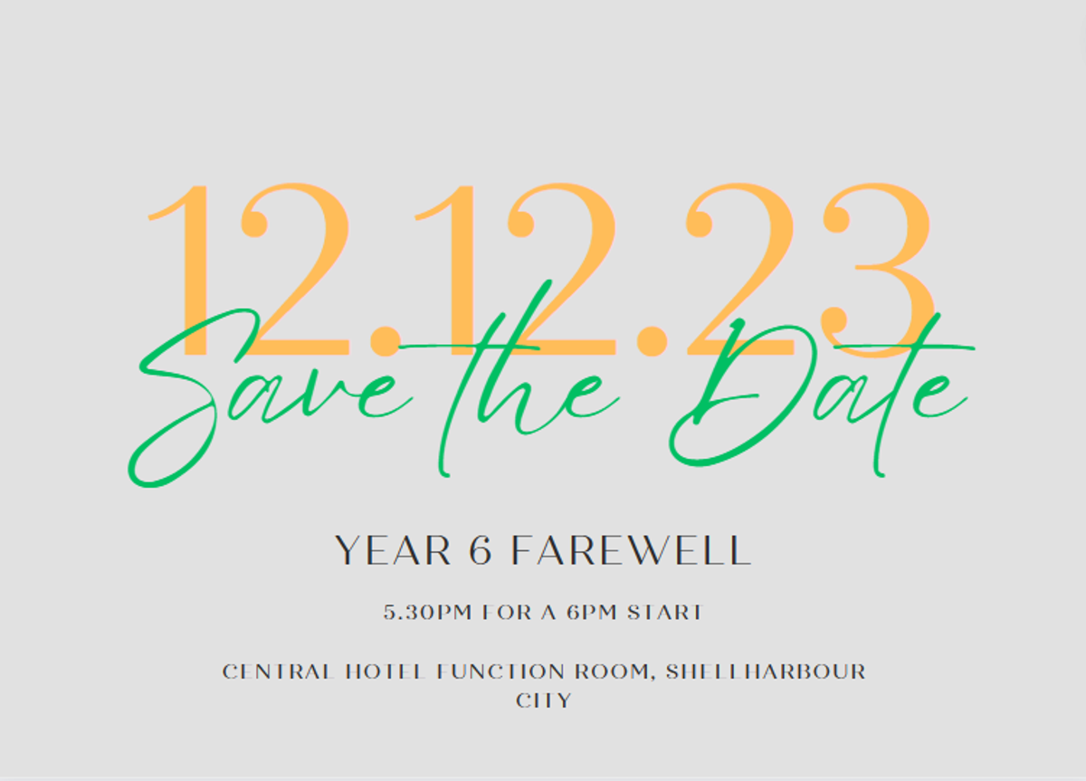 Just a reminder that the date for the Year 6 Farewell is Tuesday 12 December at The Central Hotel. Next term, Year 6 students will receive more detailed information, along with the formal invitation to the Farewell.
