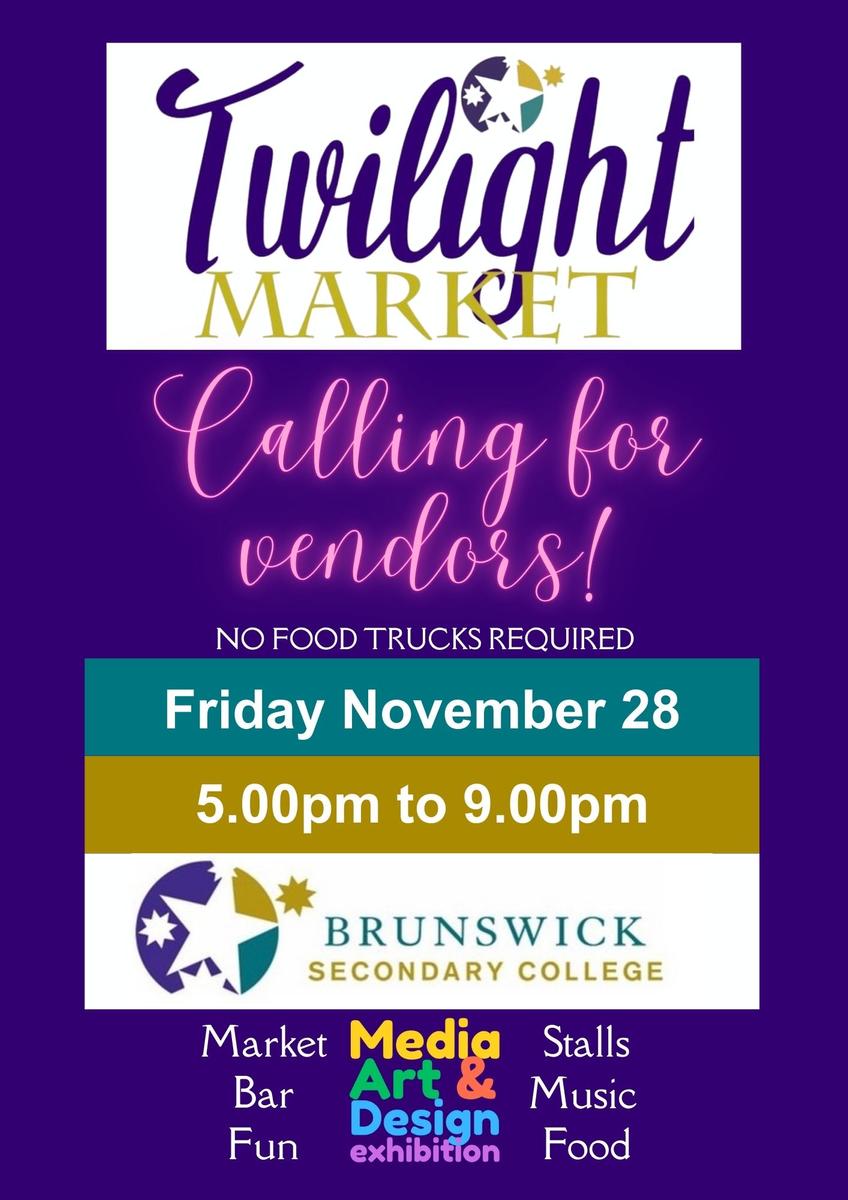 The SRC is calling for stallholders to participate in this year's Twilight Market . If you know anyone who may be interested in staging a stall, please ask them to email their expression of interest to Lindel Bell on lbel@brunswick.vic.edu.au for consideration, and to include any details and/or photos of their stall/stock that may be pertinent. There are limited stall spaces available, so be quick!