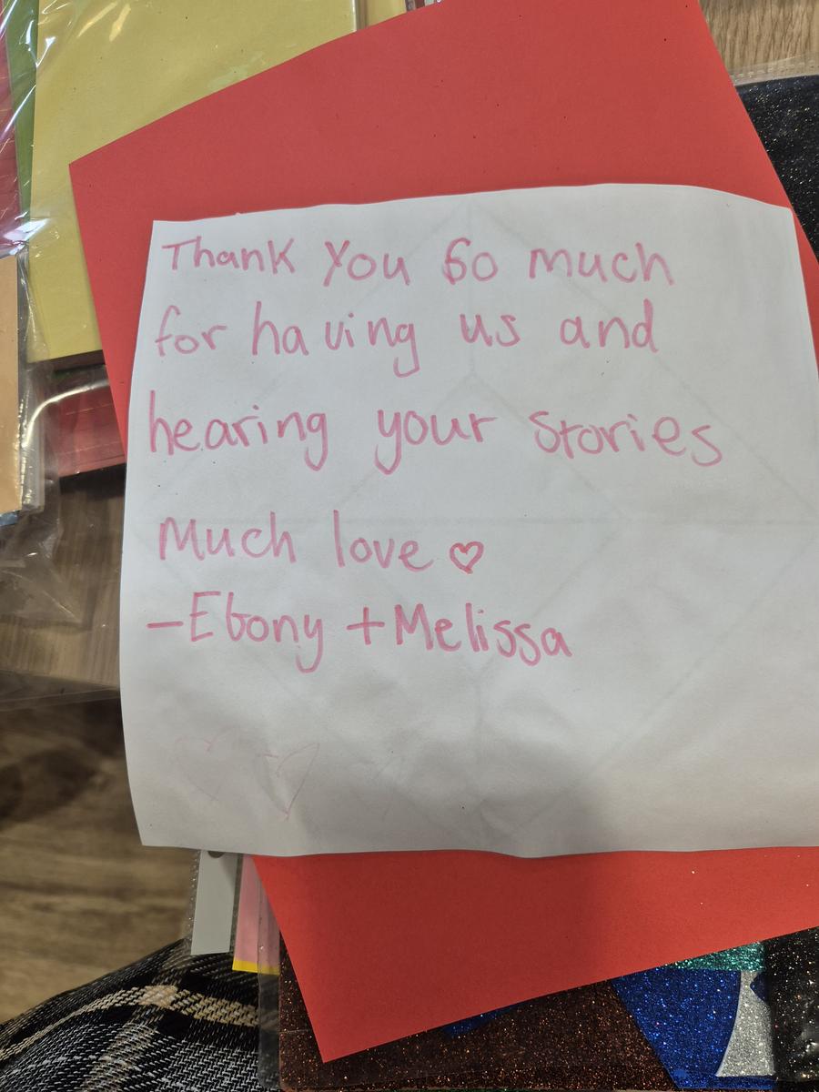 I got to know Margaret and John. Margaret was always happy and wanted to be doing something, while John was quieter but smiled and joined in when I spoke with him. The residents at my table were so excited to see us and tell us about their week.