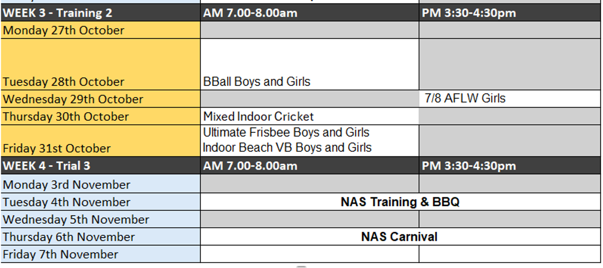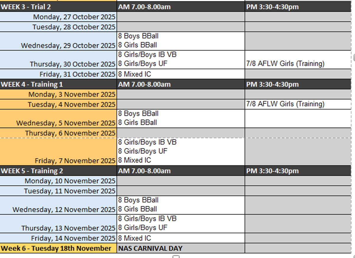 We had a wonderful first week of Year 8 NAS Trials. All students were well organised and gave their best efforts. Second trials will take place next week, see the schedule below. All students must be involved on the day, you can nominate for a NAS Teams to trial for, or as a student helper, or to play social volleyball.