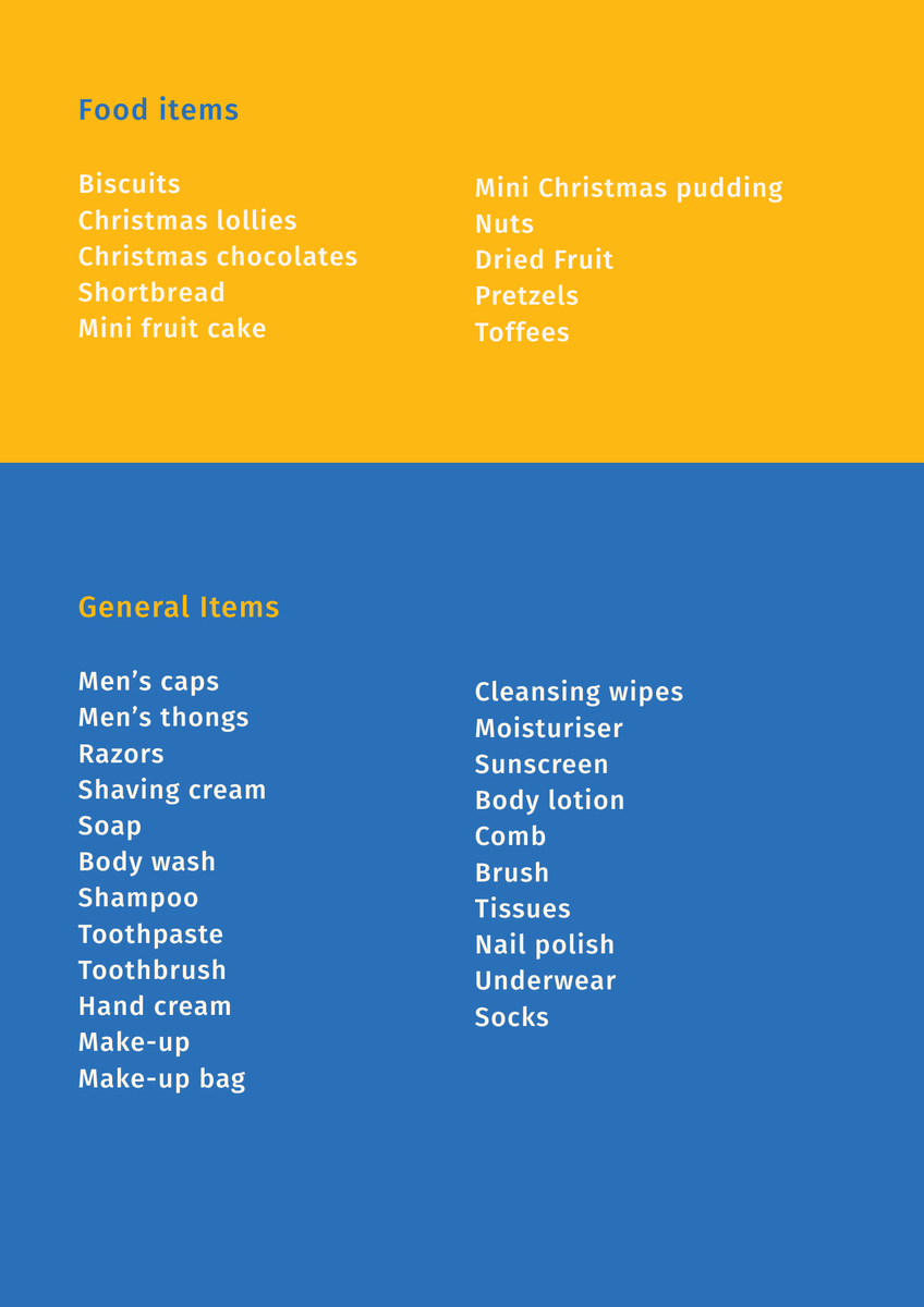 Every donation will make a real difference. Cash donations are also welcome and will support the Shopfront Christmas Lunch.