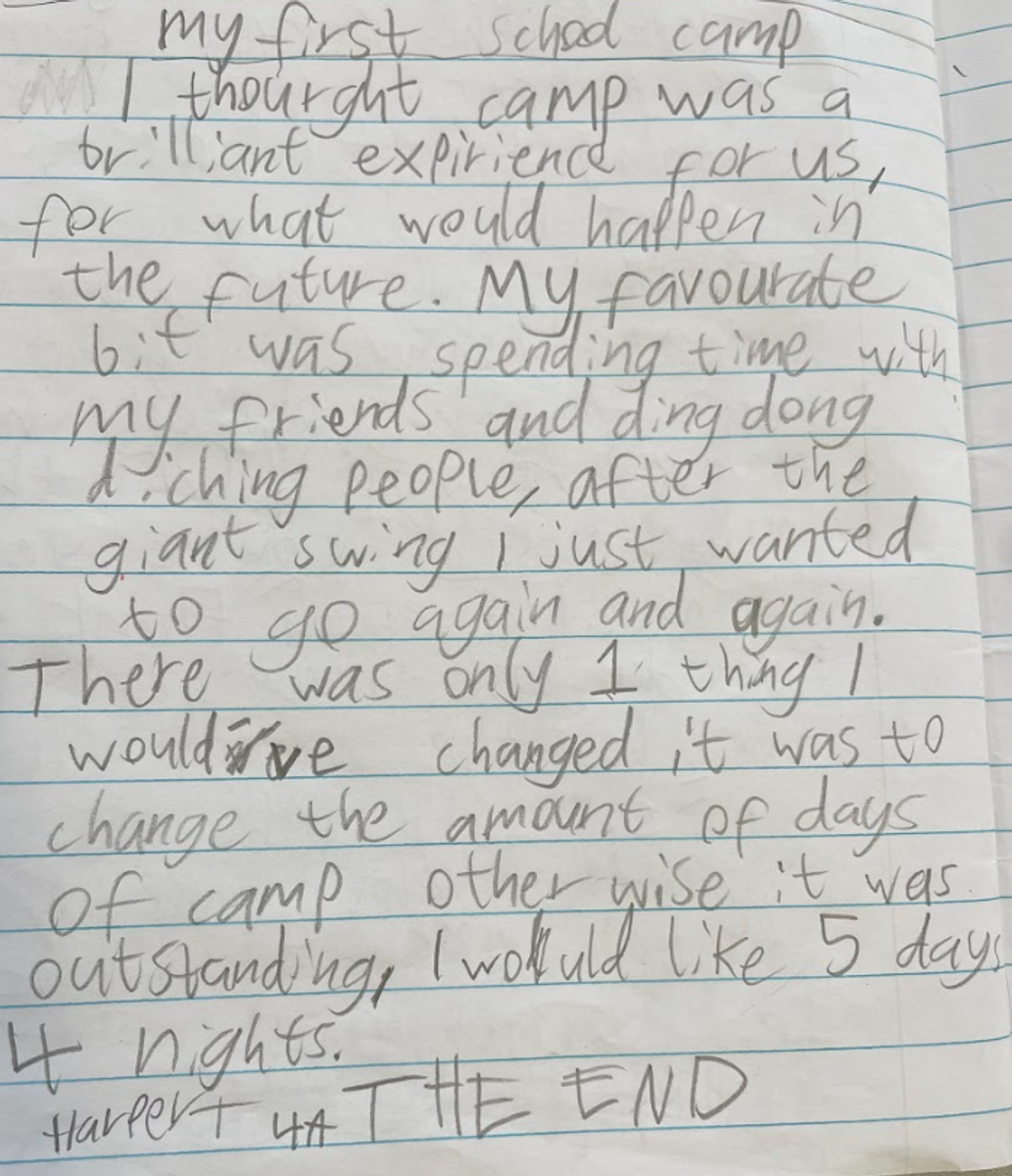 We went to camp to challenge ourselves and practice being independent. At camp I really enjoyed ‘low ropes’/parkour and the ‘flying fox’. I liked low ropes because it felt like parkour to me. I also liked the flying fox because it was a 100m zipline that if you let go you’re always safe.