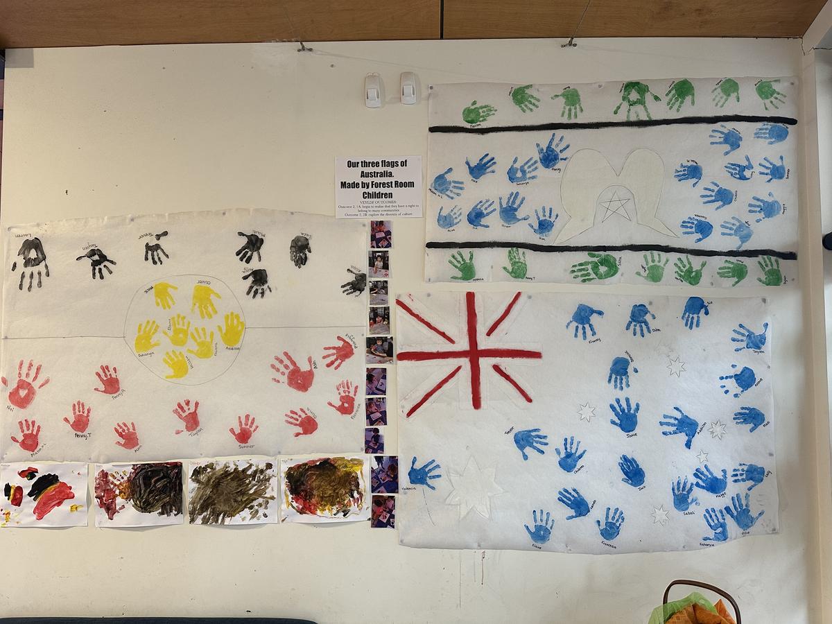 - First Nation Perspectives: We have been busy learning how lucky we are to have 3 flags here in Australia! Aboriginal, Torres Strait Islander and Australian Flag. We have learnt the different colours and meanings and identified the similarities of each flag. An info sheet has been added to our bookshelf about our flags, who made it and when it was first flown! The children have also been involved in creating our flag with their handprints.