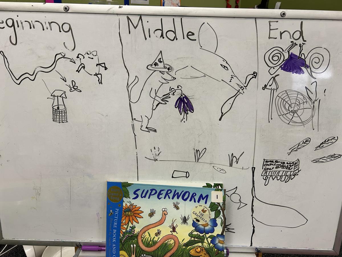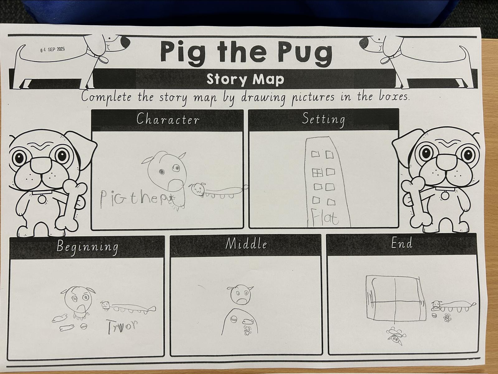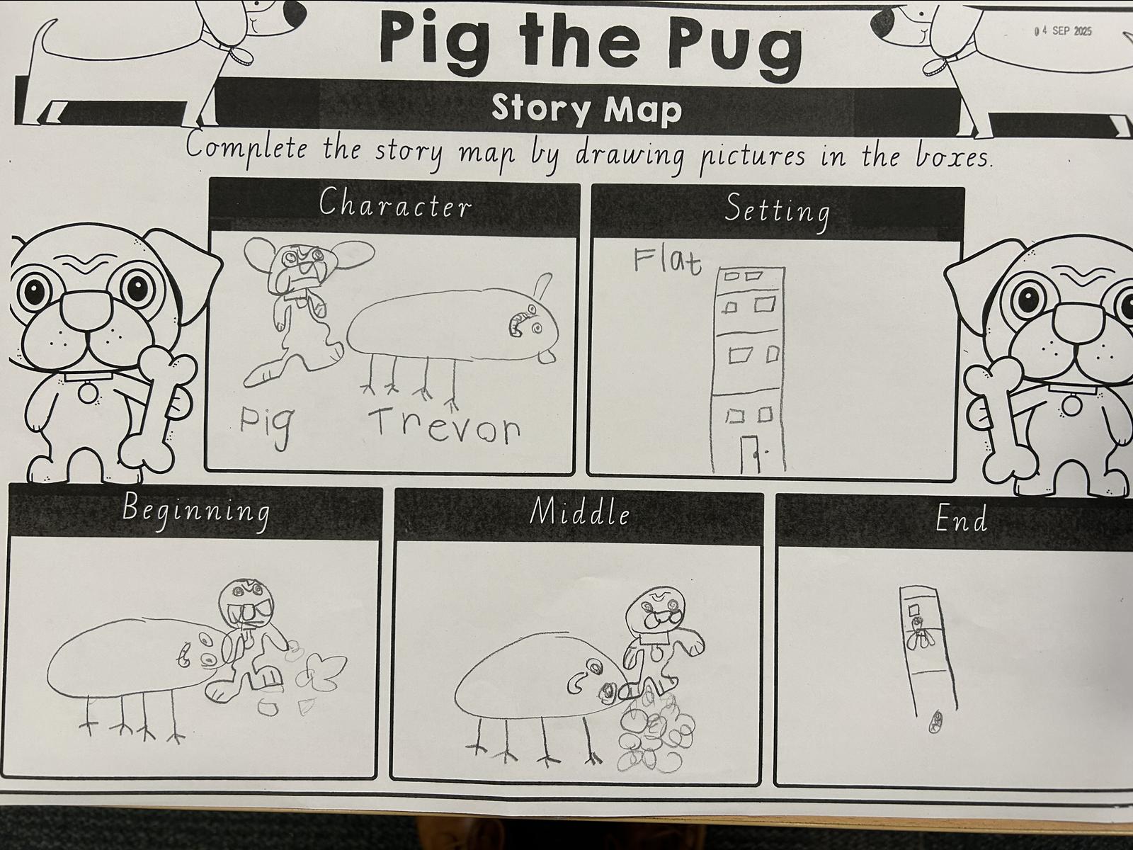 Our focus texts have been Pig the Pug and Superworm. Using these stories, students identified the main characters and settings. They also created story maps to draw and retell the key events, organising them into the beginning, middle, and end of each story.
