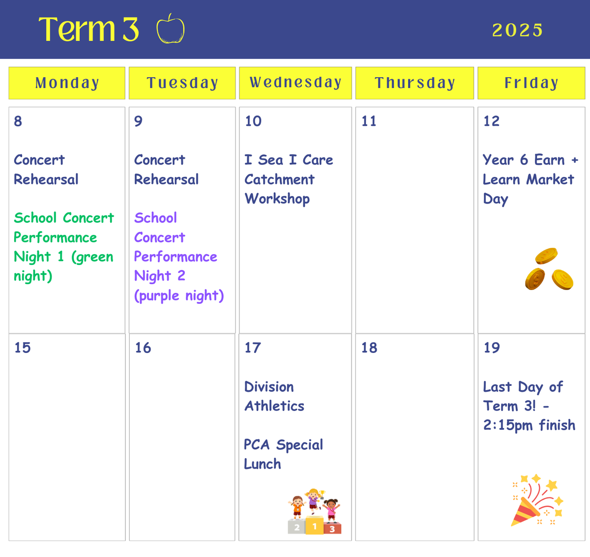 Term 3: Monday 21 July - Friday 19 September (Finishing 2:15pm)