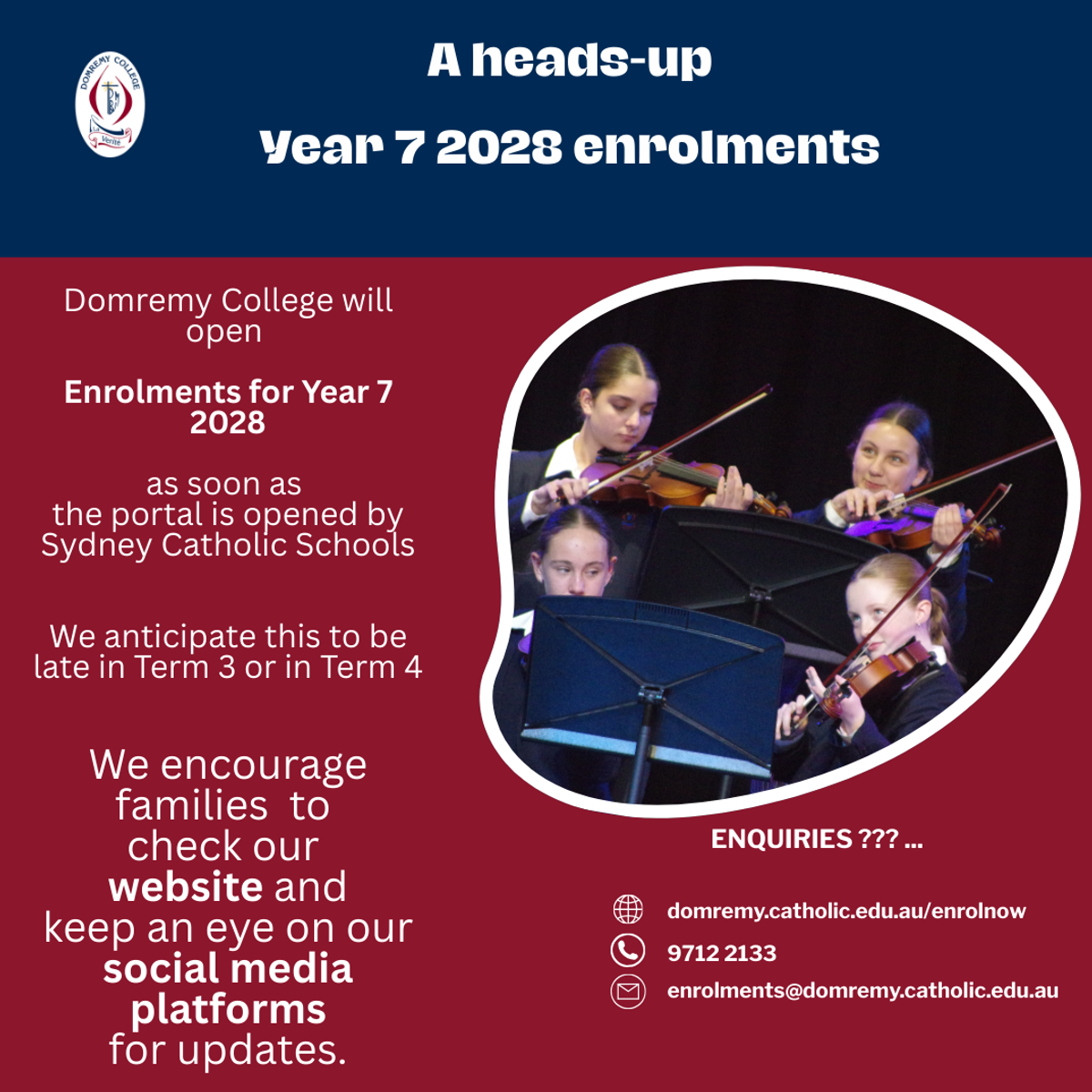 For Year 7 2028 Enrolments at Domremy, see the flyer and circle back to the College's website and social media for the latest updates about when the enrolment period opens.