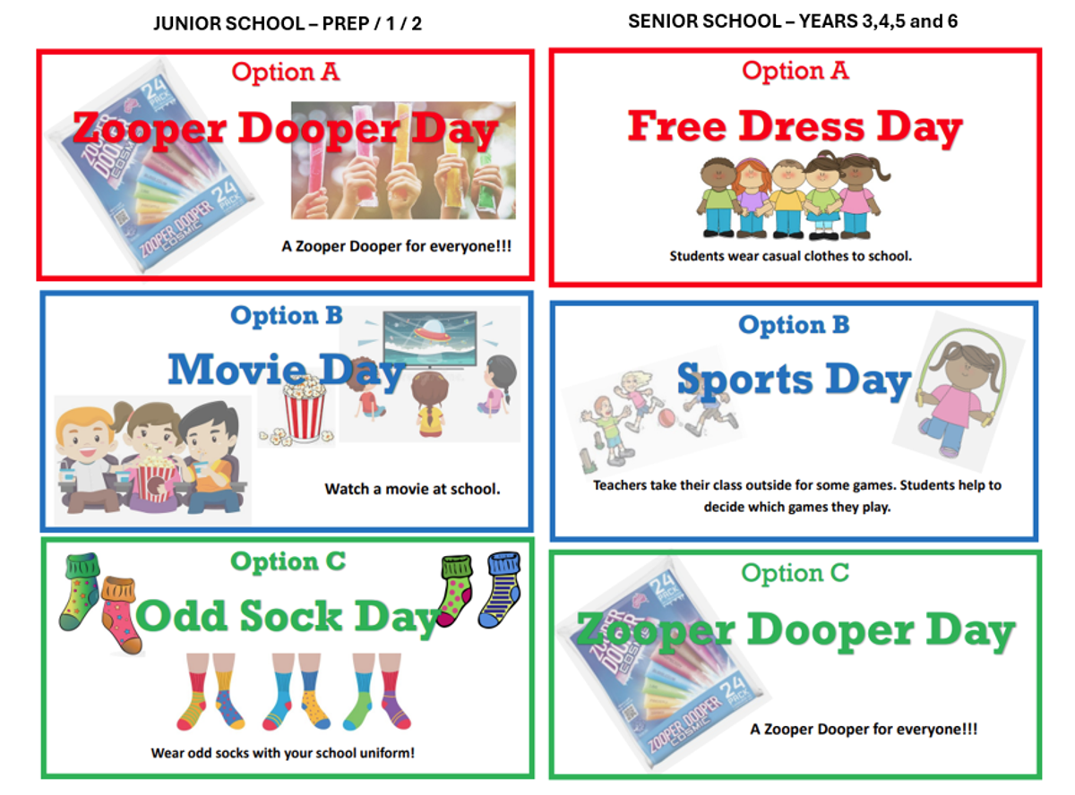 Our School Captains, Vice School Captains and House Captains have selected the following end of term reward options for Term 4: