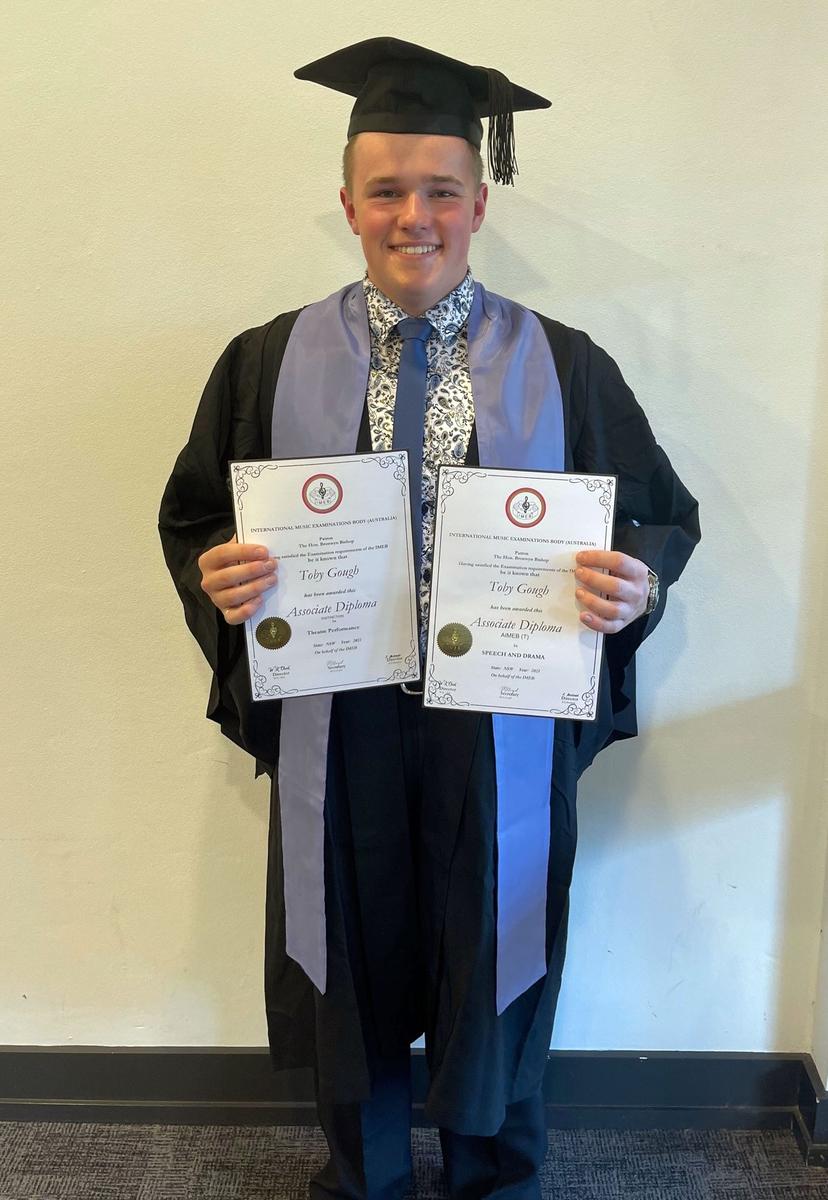 Toby Gough recently attended the International Music Examination Body Graduation Ceremony. He was awarded his Associate Diploma of Speech and Drama (Teaching), and Associate Diploma of Theatre Performance Arts, with Honours.