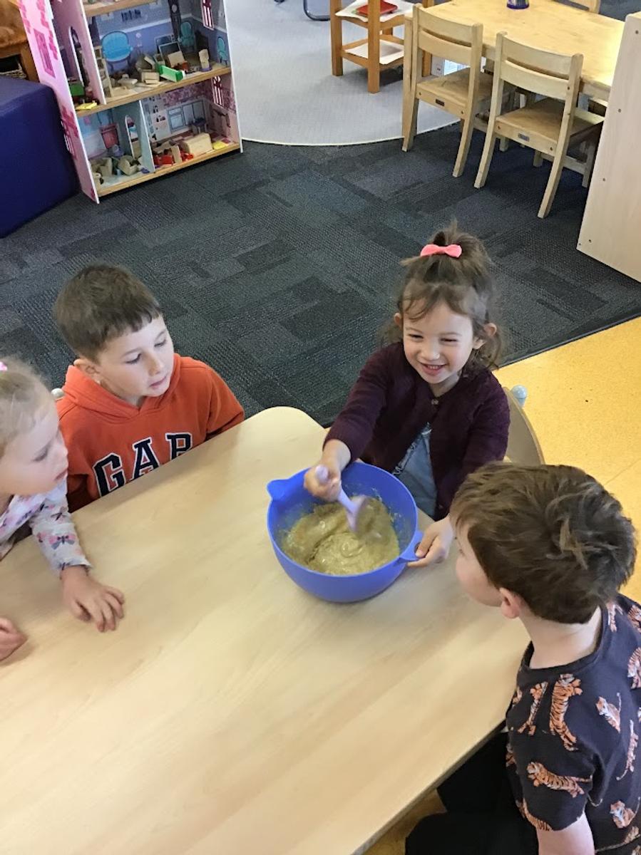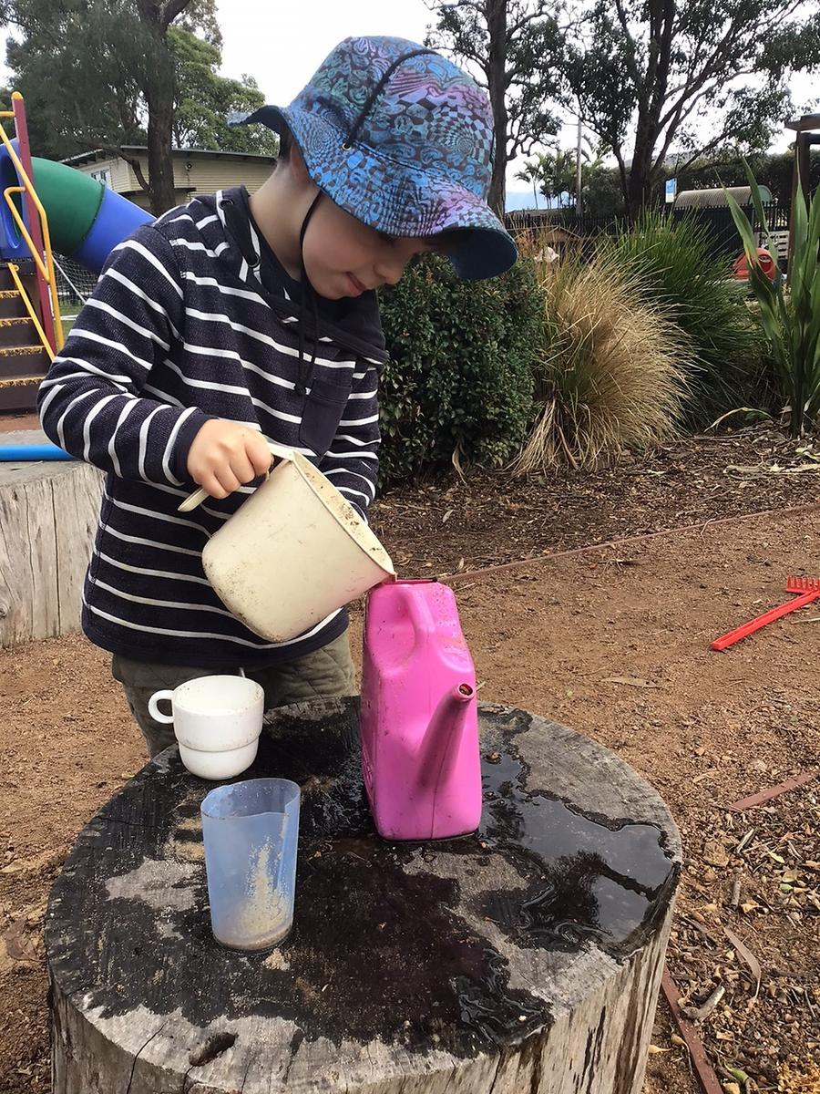 Using the variety of blocks and construction pieces the children can build to tall heights. They also know that at preschool the limit to a building is their own height for safety reasons. This has prompted discussions on measurement and the introduction of using a one metre ruler. Making patterns, finding shapes, considering size, volume and time all are present in our day. The children are becoming aware of how long 3 minutes takes when they use a timer to wait for a fair turn of a toy. When the children dig in the dirt, sand and mix mud they can be heard asking for more water or saying that they have too much sand. This often occurs in the mud kitchen where the children create wonderful recipes. Volume and measurement are also explored through cooking experiences too. It is through this social setting where many conversations and questions prompt and extend the children’s mathematical thinking.