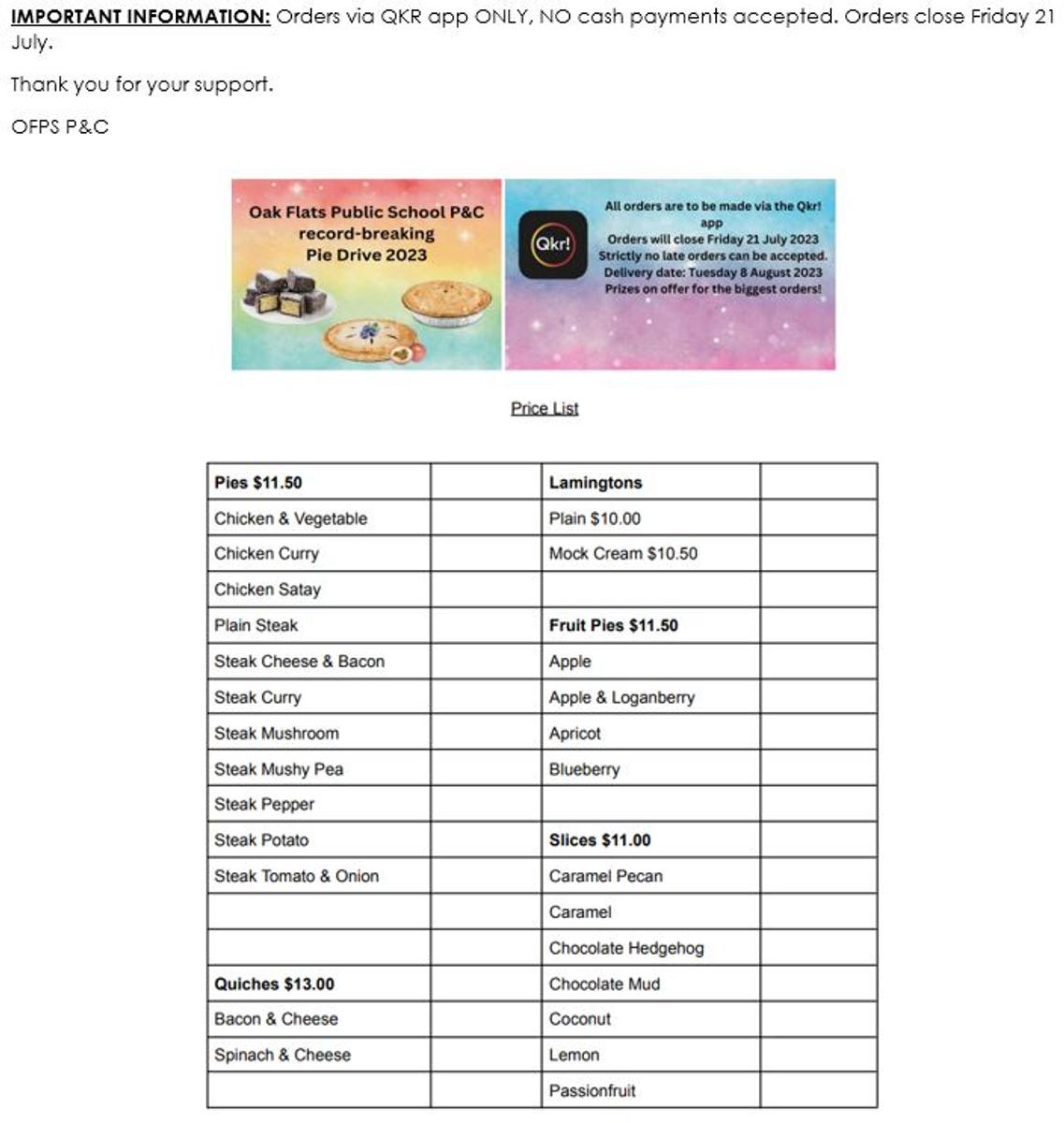Orders have launched and are up and running in the QKR app! Orders will close on Friday, 21 July. Strictly no late orders can be accepted. The pies will be delivered on Tuesday, 8 August. Once the orders have been packed, a Facebook message will be posted and texts will be sent to advise that the pies are ready to collect. Pickup is estimated to be from 1pm. All orders need to be collected by 3:30pm on the day.