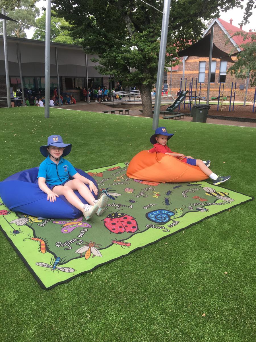 The children are thoroughly enjoying the new turf "Quiet Play" area. Year 2 enjoy this space for their lunch eating area as well as breaking out there for some lessons. Thank you Stage 2 for your colourful bean bags- they are prized as prime seating spots. Many activities take place here, such as chatting quietly with friends, reading, small toy play, or just sitting.