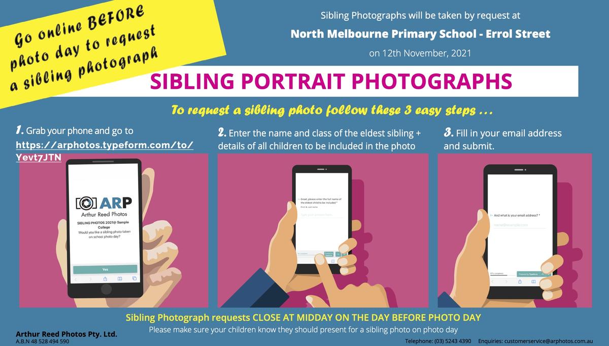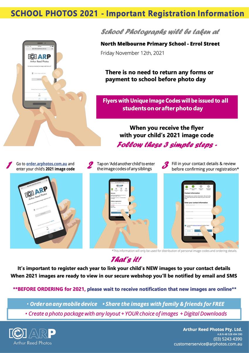 Annual school photos including sibling photos will be taken at North Melbourne Primary School by Arthur Reed Photos on Friday 12 November 2021.