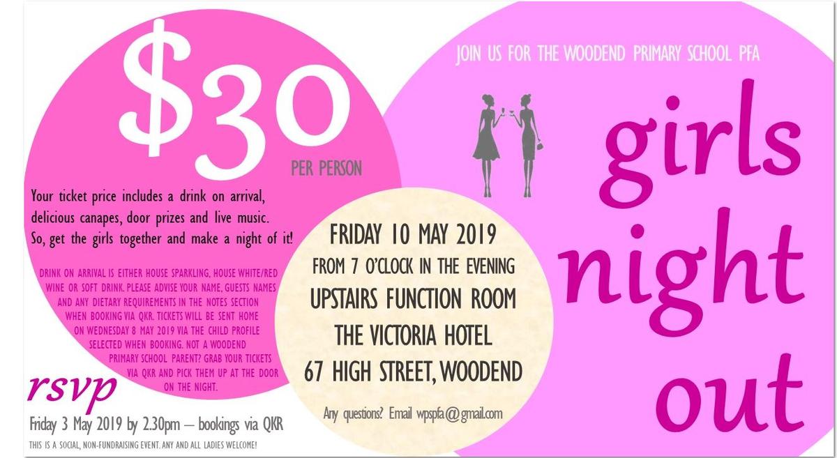 You're invited to join us for the Woodend Primary School PFA Girls' Night Out on Friday 10 May 2019.