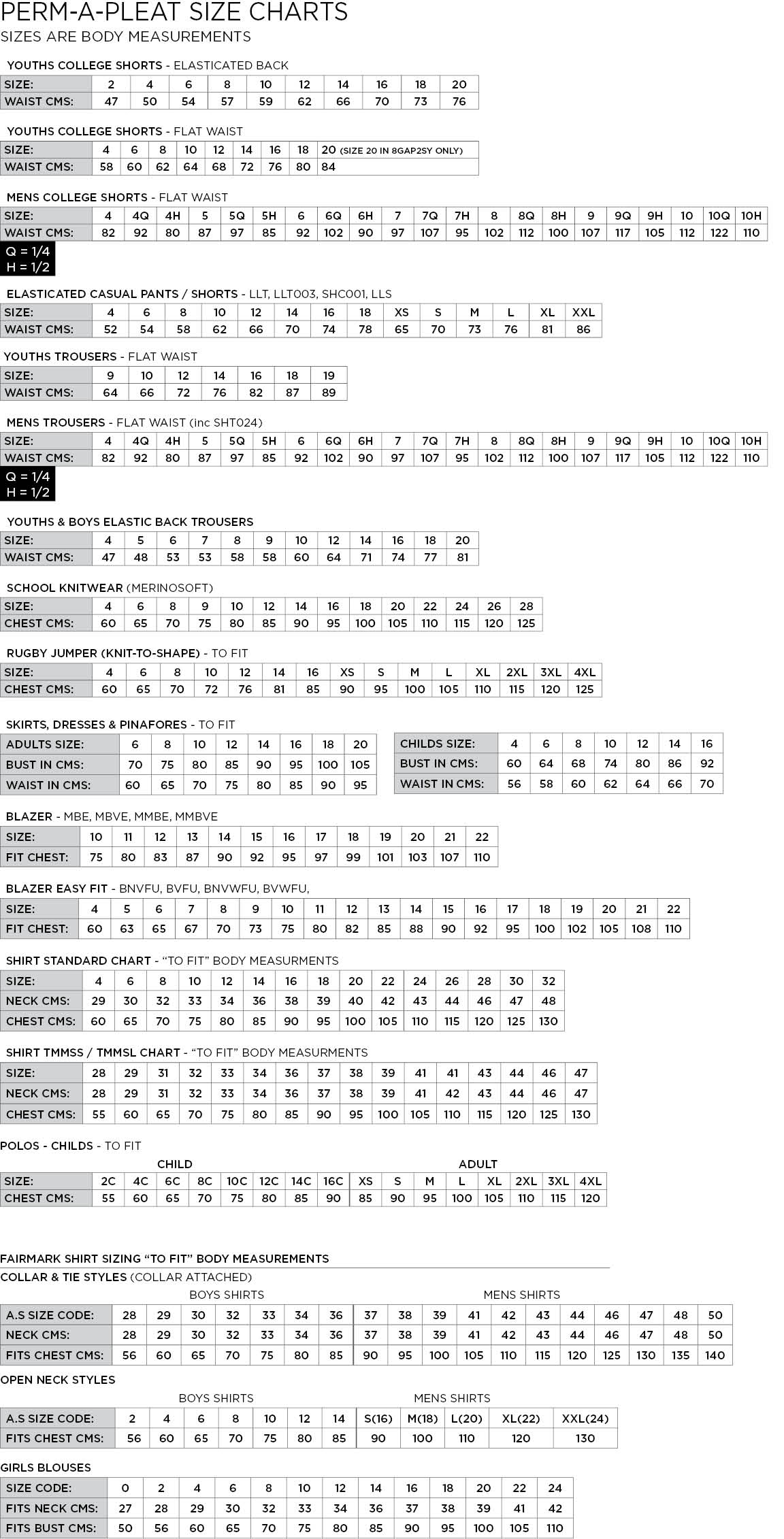 Our Uniform Shop Staff will be able to help you at the time of your appointment or if purchasing On-line, Perm-a-Pleat have included a sizing guide on our On-Line Shop site: