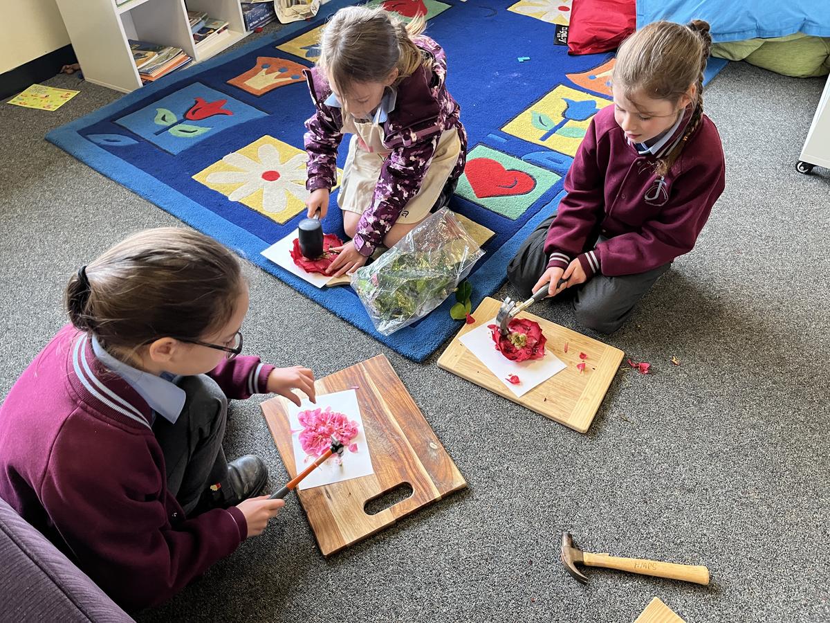 The students also brought in many flowers, leaves and petals along with their hammers to pound onto paper ready to put into frames for this week's session. These will be on display at our upcoming Art Show. There were not too many fingers that got in the way of the hammering - they did a great job of listening, following instructions and being very careful.