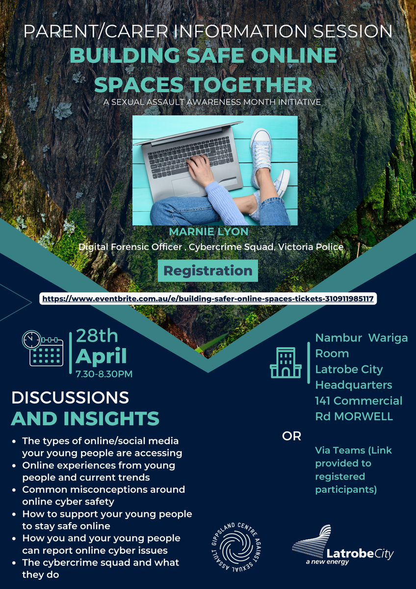 As a part of GCASAs activities during the Sexual Assault Awareness Month (SAAM), in conjunction with Latrobe City Council, we are proudly hosting a live face to face event as well as streaming it to parents and carers across Gippsland. In line with this year’s theme ‘Building safe online spaces together’ we are hosting Marnie Lyon – Digital Forensic Officer from the Cybercrime Squad of Victoria Police. Marnie will be talking about the types of online/social media that young people are accessing, some of the experiences young people have had, including local information, how adults can work together with their children and young people to stay safe online and more.