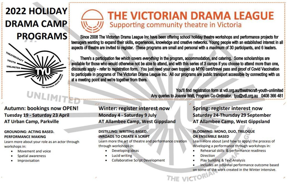 I’m currently involved in running a program of drama camps with Theatrecraft Youth Unlimited, a branch of the Victorian Drama League. We facilitate camps that strengthen skills in theatre and acting, and other stagecraft areas if that’s more your thing. We’ve got an exciting year coming up, running three camps in each set of school holidays. Our first camp ‘Grounding’, in Autumn, heavily focuses on developing skills to work together as an ensemble and devise works specifically in physical theatre. We have more than 15 sessions over the course of the camp, each working towards an in-house performance. It’s going to be lots of fun and I can guarantee you’ll learn a great deal.