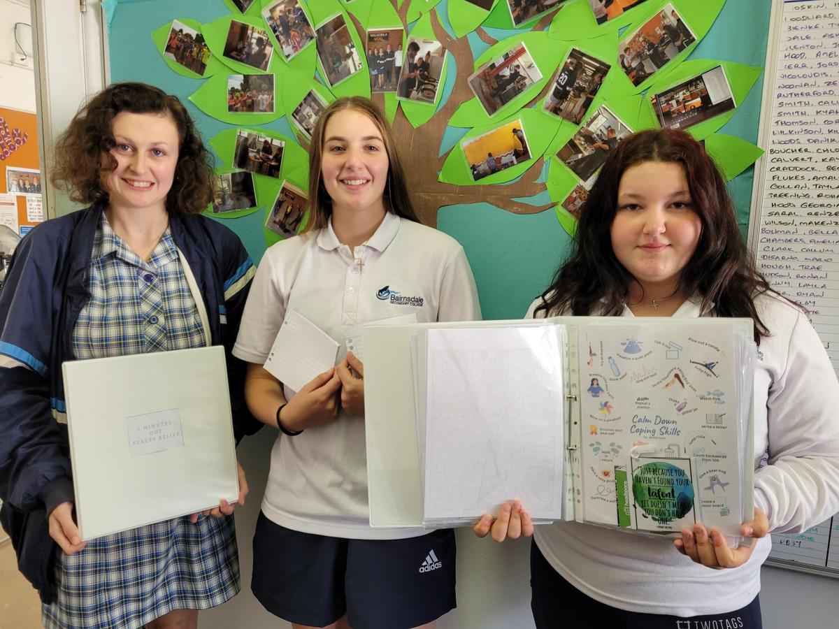 For their mini project, Intermediate VCAL students Jorja Glenton, Madi Grimsey and Kilarnee Wilkinson created wellbeing packs for each off the hubs, for students to use when needed. They contacted outside agencies for flyers and business cards also.