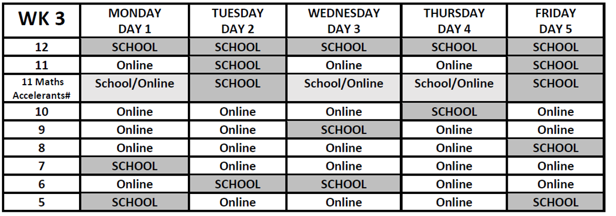 The program for Term 2, Week 3 is below. We will be carefully monitoring this program with a view to increasing to a full return to face to face teaching. This plan remains under active consideration and review.