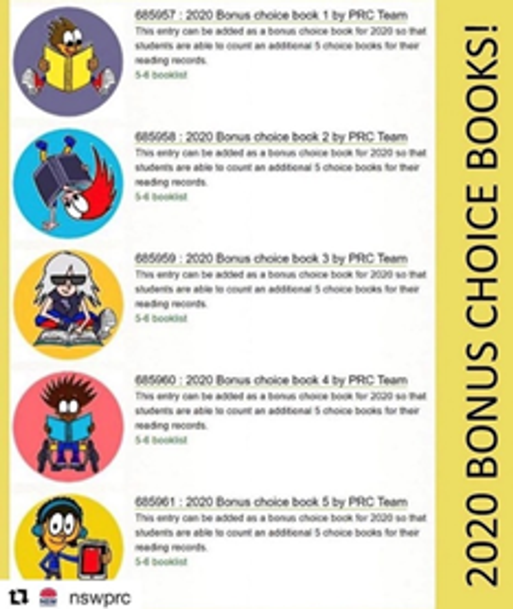 To help support students who are #learningathome and may not have the same access to #NSWPRC books as they would normally, the PRC have increased the number of choice books you can enter on your reading record this year! They will need to be added to your SRR (Student Reading Record) by adding the "bonus choice book" options that have been added to the PRC booklists. These are on the 5 - 6 challenge so that all students are able to count them towrads their books for the 2020 challenge. Some other updates to the 2020 rules have just been announced, so head to their website for more information about this and other adjustments to the 2020 PRC. https://online.det.nsw.edu.au/prc/home.html