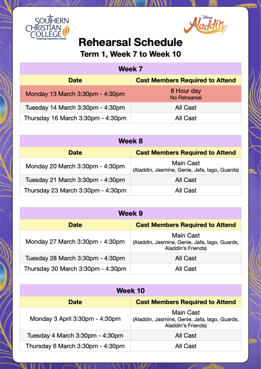 The Southern Christian College production for 2023 - Disney’s Aladdin JR. Students who are involved in the production have rehearsals as follows: