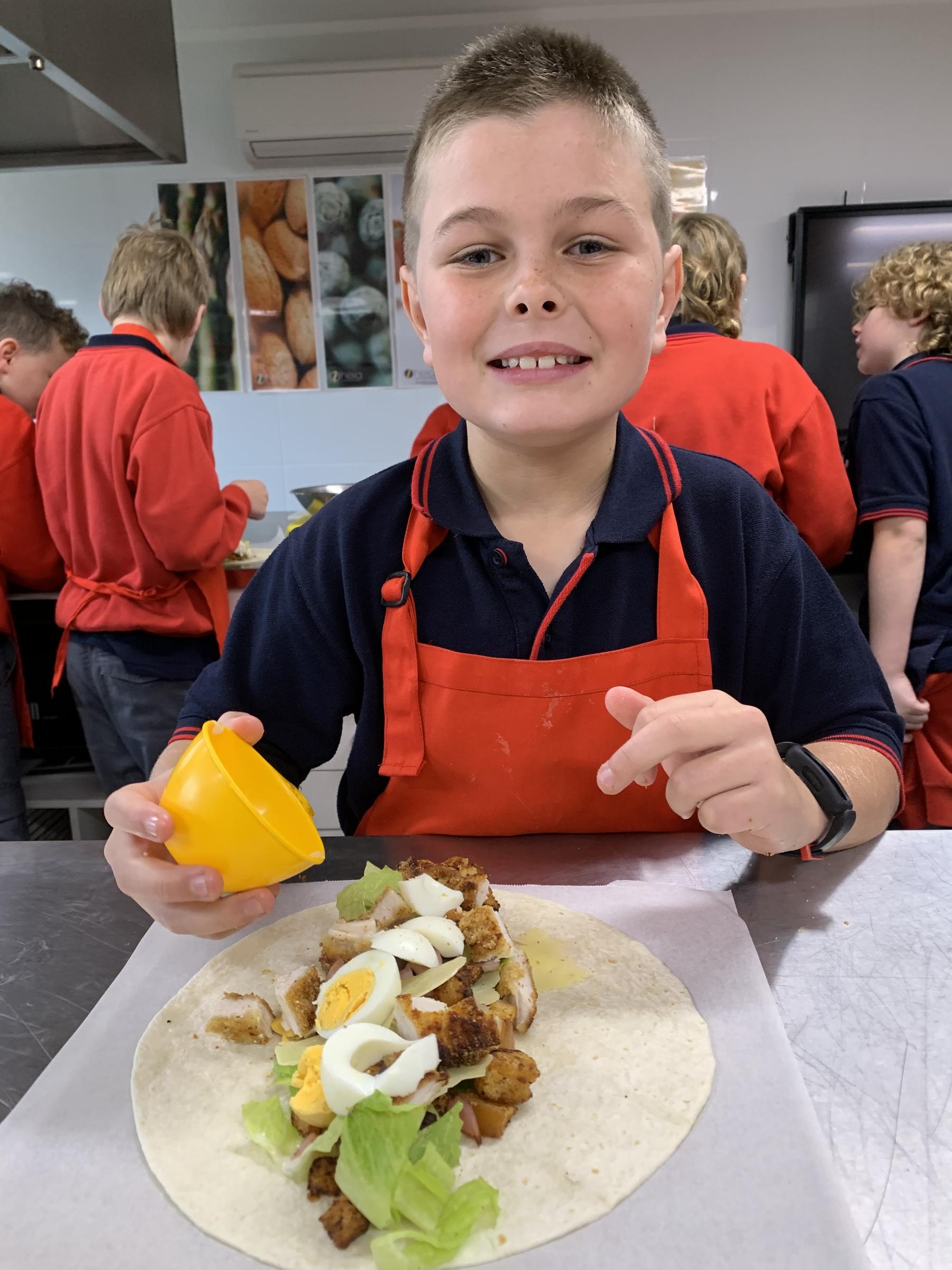 The 4/5 Class attended a double period of cooking this week to allow them to produce something a little more advanced making Crunchy Chicken Caesar Wraps. Students learnt how to crumb a piece of chicken, boil and peel eggs, make croutons and shred lettuce. The wraps look delicious. Well done to Year 4/5, who have shown a huge leap in skill development.