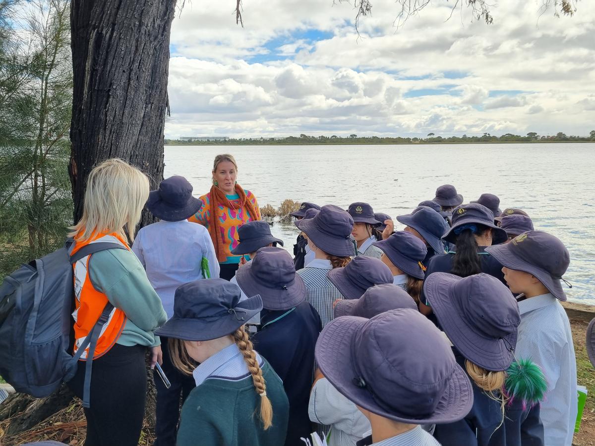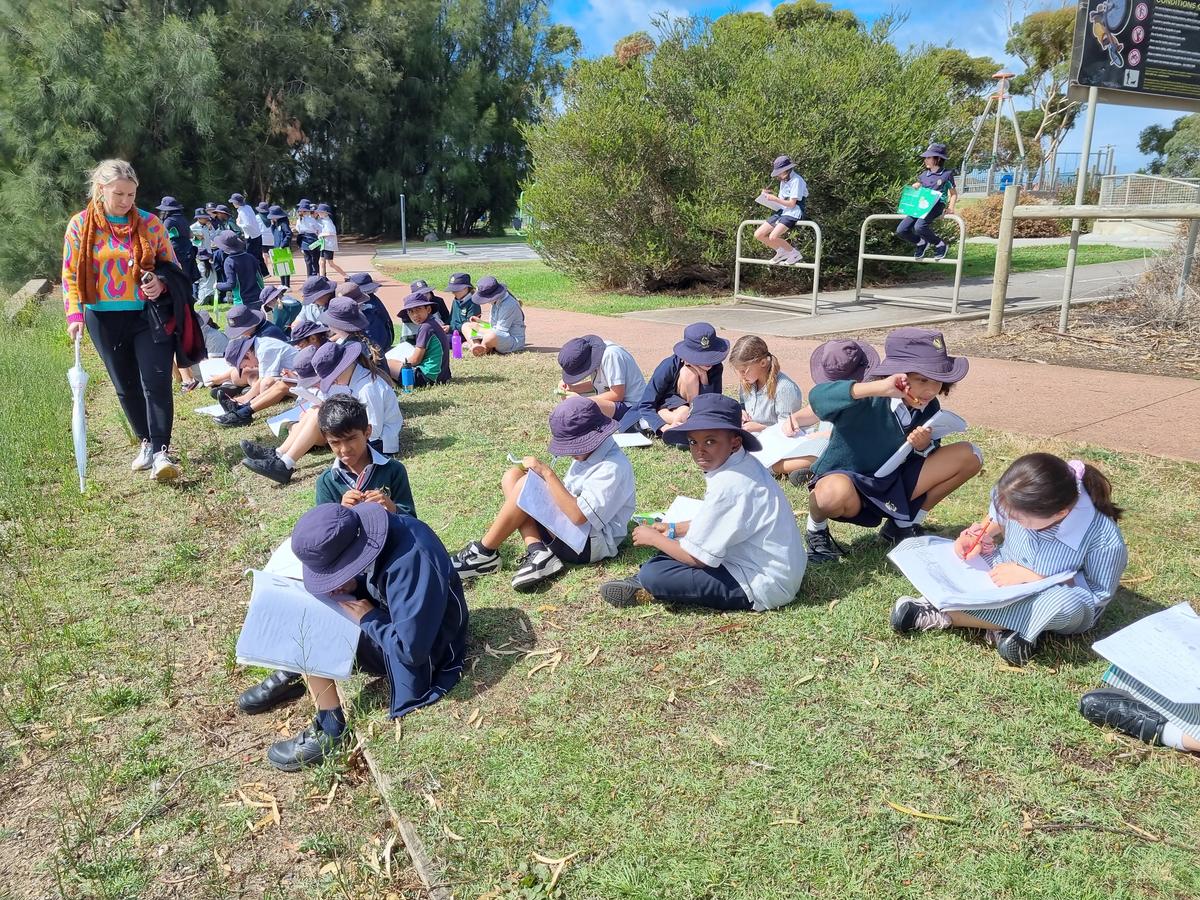 On the 30th of March 2023 the year 3s and 4s went on a walking excursion to Cherry Lake. We all walked past Sugargum Drive and also saw the Athletics Field, then we all arrived at Cherry Lake. Once we got there, we saw the drooping sheoaks all around the lake and there were a lot of ducks swimming underwater and on land there were also swans. We walked to an old tree that had empty Cicadas shells and Ms Broughton put one on her jumper. All the plants had been blown to an acute angle. Once we found a clear place to sit down, we started to draw some things that we saw around us. We saw swans, rainbow lorikeets, swamp hens, galahs and an ibis (bin chicken) at Cherry Lake. After that, the year 3s and 4s got to have a ten minute break to play on the playground. The swings were a popular place to be on the playground. There was a zipline. It was also a popular place to be. It was an amazing time at cherry lake. We hope to go there again some time soon.