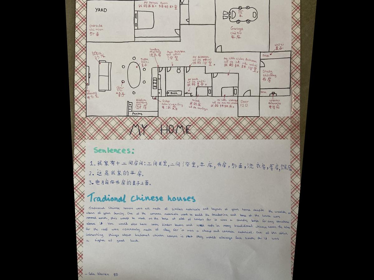 In Term 3, during the remote learning time, Years 7-9 classes were working on the Chinese project work in both Chinese and English. Year 7 students did some research on the Chinese Family Structure, in the old or modern time. They also created their own family trees and described their families in Chinese language. In Year 8, students did some research on the Chinese architecture. They also drew their own house or dream house and introduced their house, rooms, and furniture in Chinese. Year 9 students who are in the Chinese language classes made a role-play for shopping in Chinese. They did bargains by using the Chinese currency and made their comments on what they wanted to purchase. Lots of students showed their great efforts and worked quite productively. Here is the work for sharing: