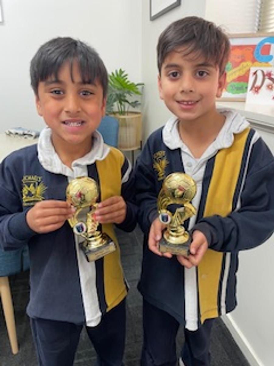 Congratulations to Issac Makhoul (1/2RF) and Aiden Makhoul (PS) on receiving trophies from the Fawkner Soccer Club because they worked very hard throughout the entire season. Well done, Boys!!