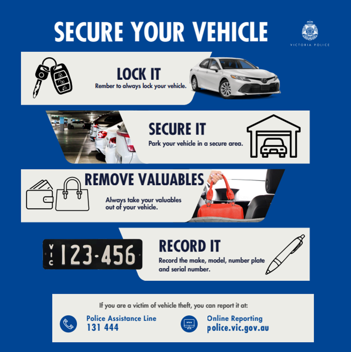 With an increase in car break-ins and thefts, the Vic Police have asked us to remind families in our community to ensure their vehicles are securely locked. Please see the poster below for some simple tips.