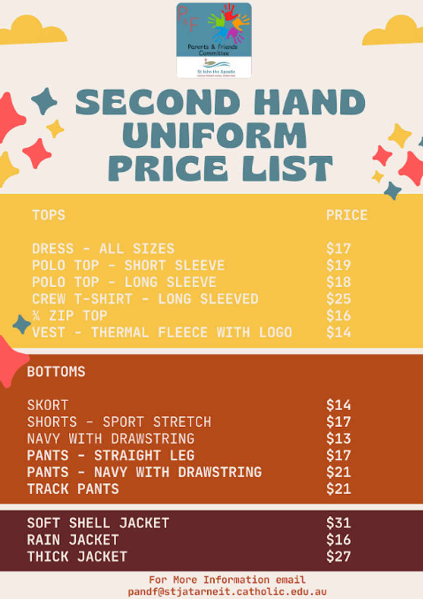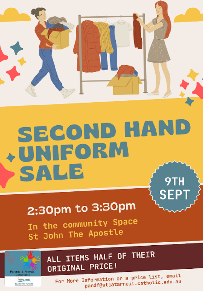 Our Parents and Friends will be holding a Second Hand Uniform Sale on Tuesday 9th September from 2:30 - 3:30 in the Community Space. A reminder that all items which families hope to include in the sale, must be labelled with Parent Name and Phone Number and handed into the Office by this Friday 5th September.