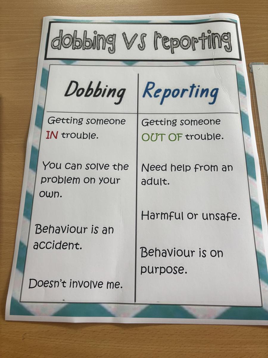 The Grade 1/2s focused on Teamwork, what the word "Bully" means and the difference between reporting and dobbing. We discussed how teamwork makes things easier when we are all on the same page, and why it’s important to speak up about big problems, but not to “dob” about small things. We know that 'Reporting' is getting someone out of trouble and 'Dobbing' is getting someone in trouble. We started by building the tallest tower out of popsicle sticks, the group who succeeded discussed not giving up even if other groups may of been ahead. We then role played different scenarios that might be dobbing, or reporting.