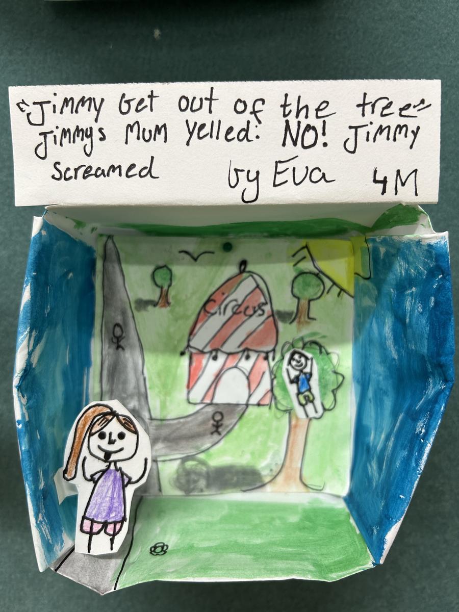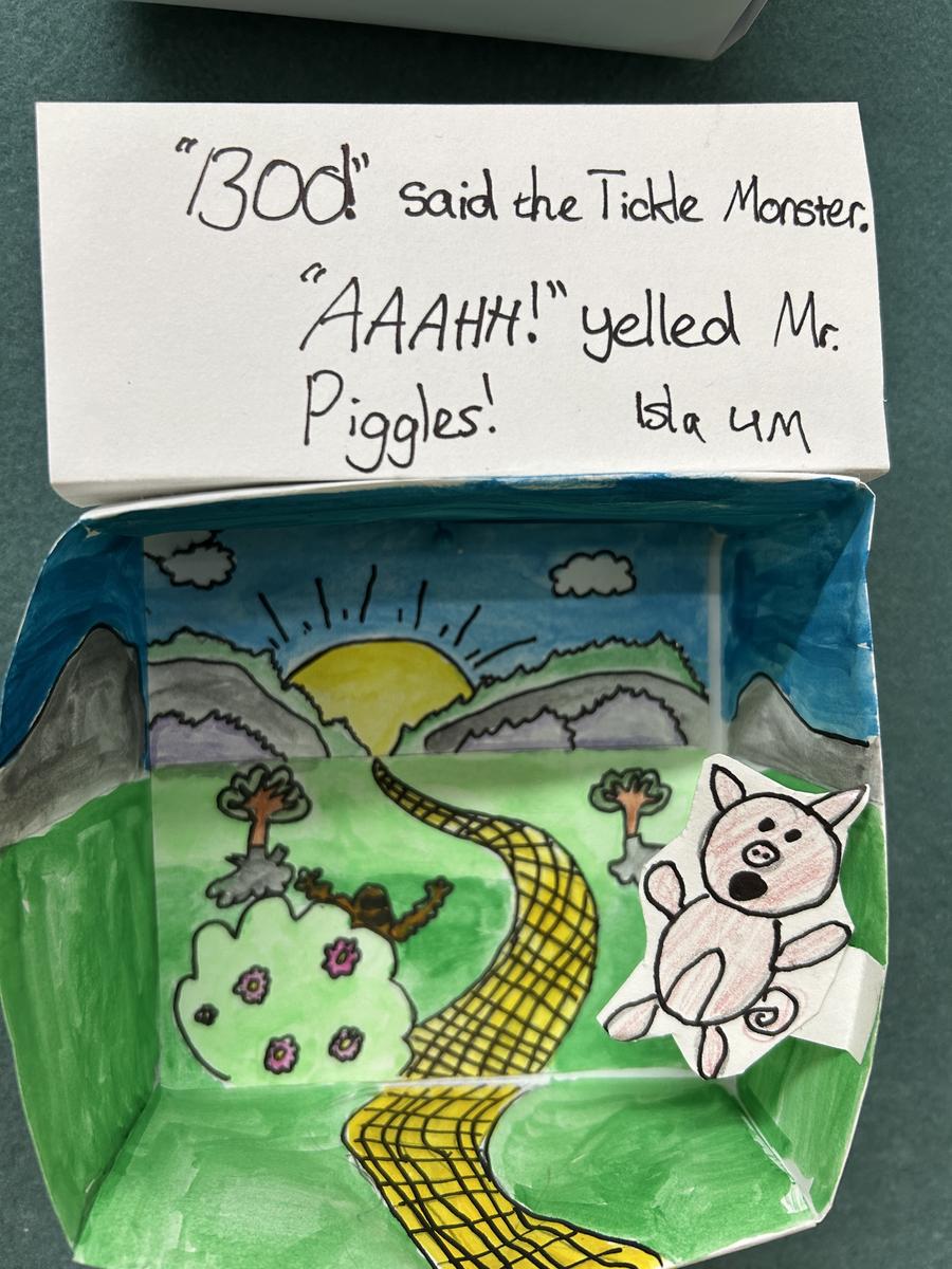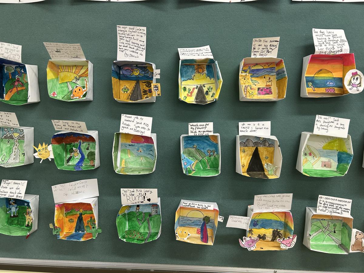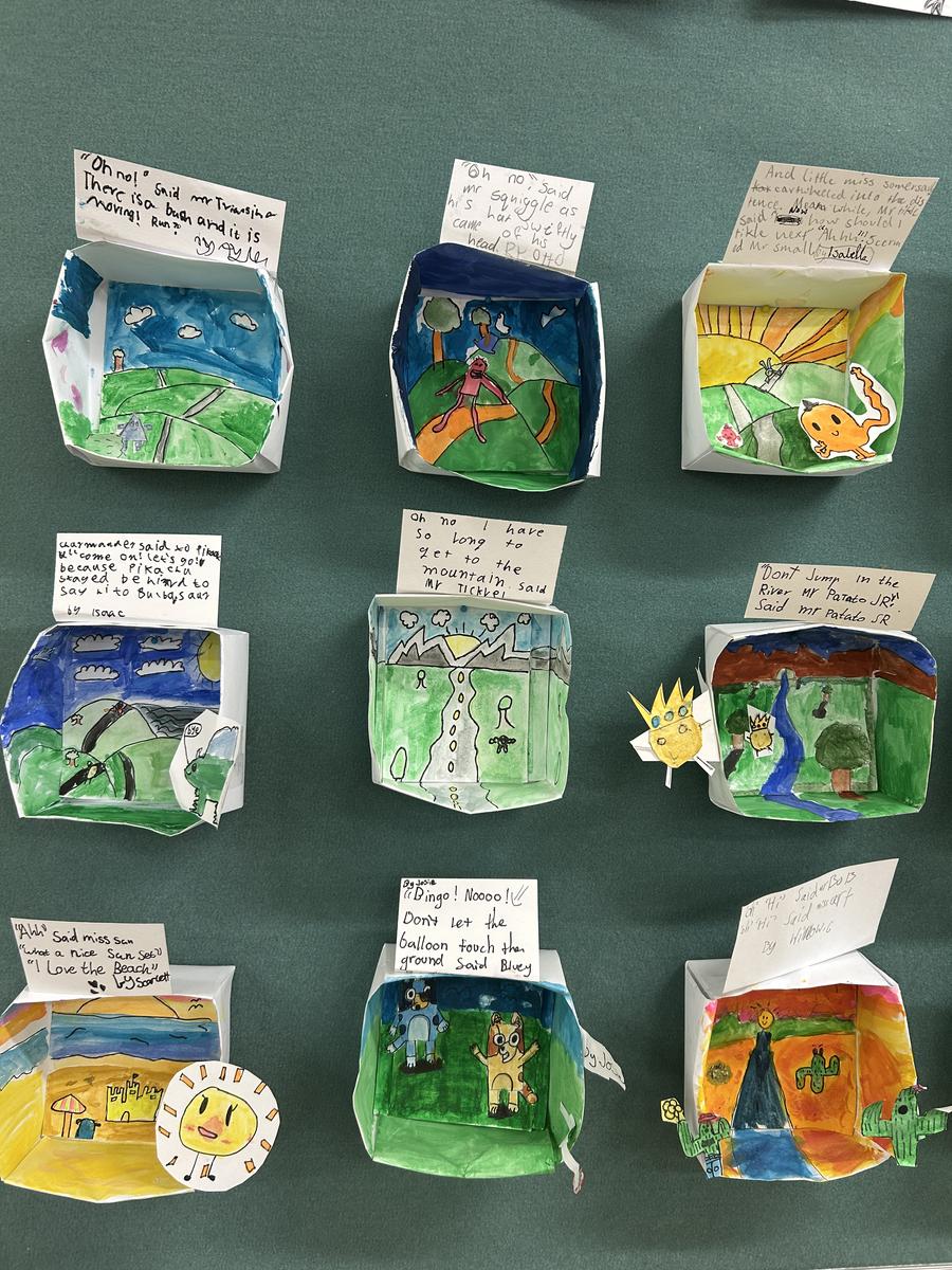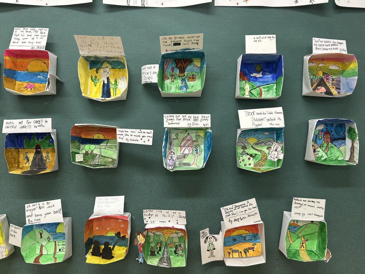 Students in grades 3 and 4 have been busy sewing toadstools, and creating perspective drawings through their 'story in a box'.
