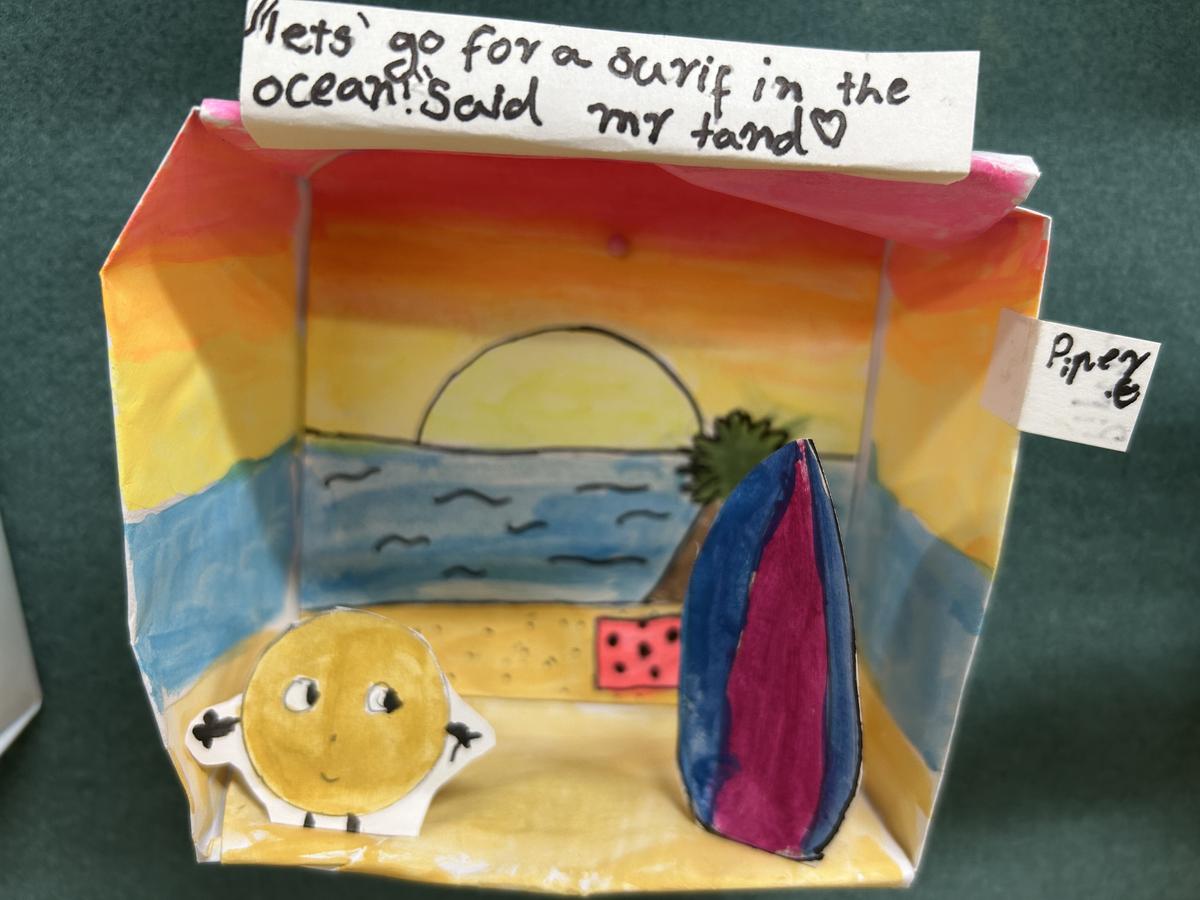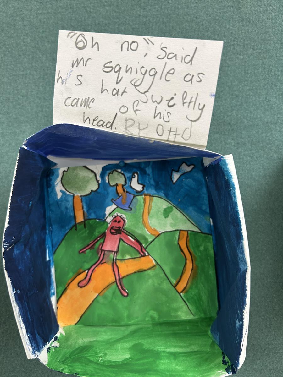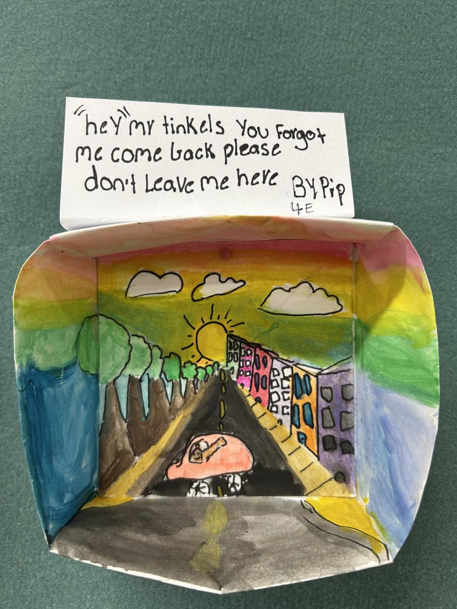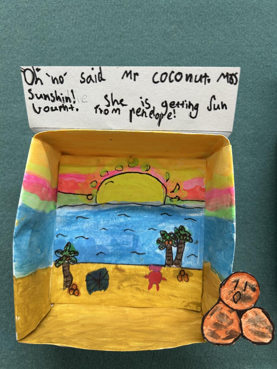 Students in grades 3 and 4 have been busy sewing toadstools, and creating perspective drawings through their 'story in a box'.