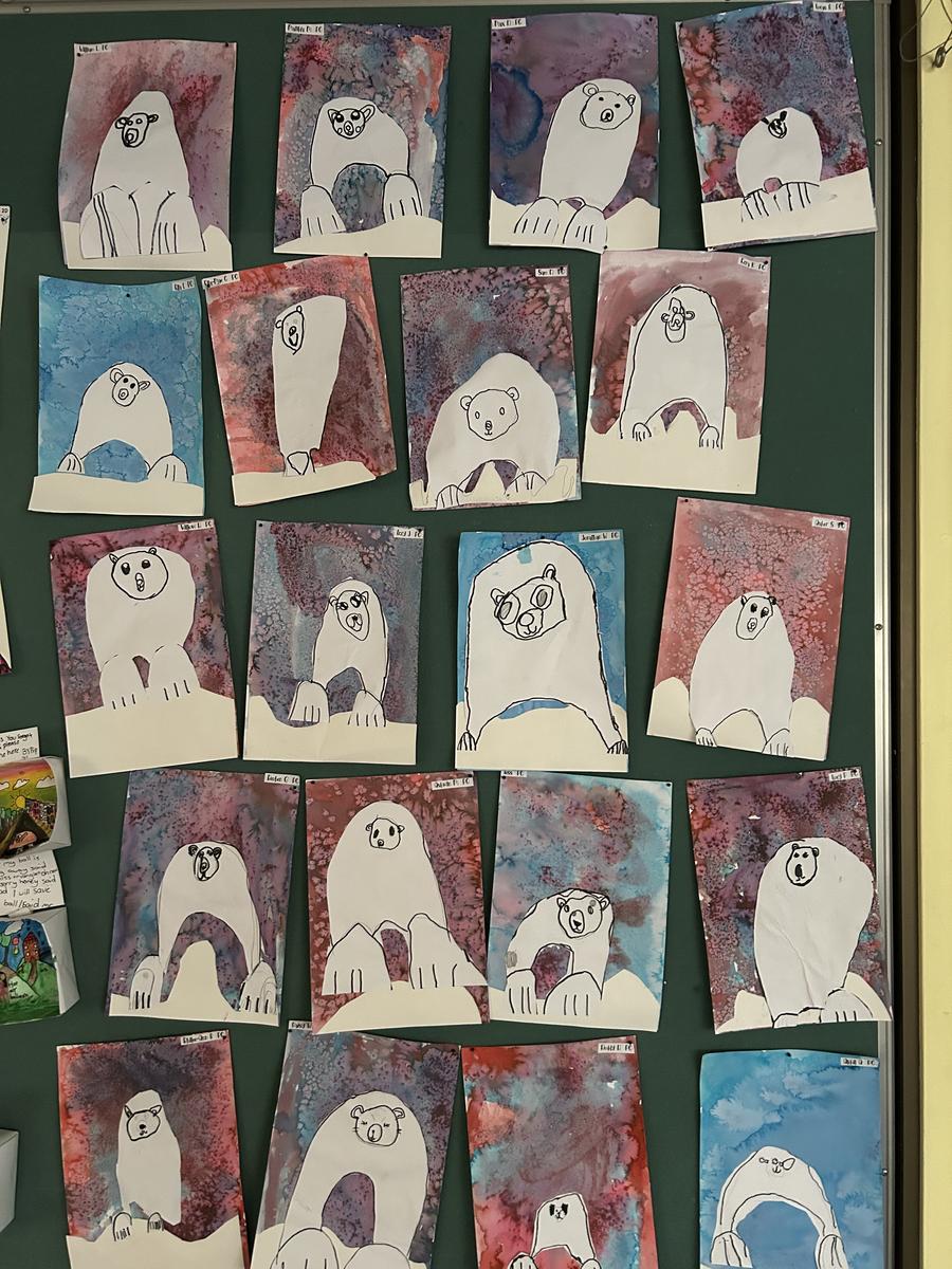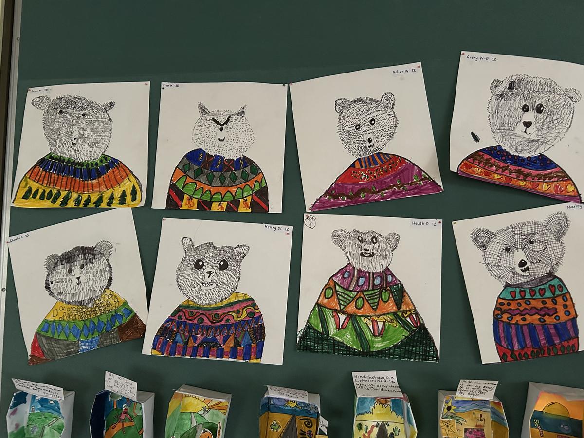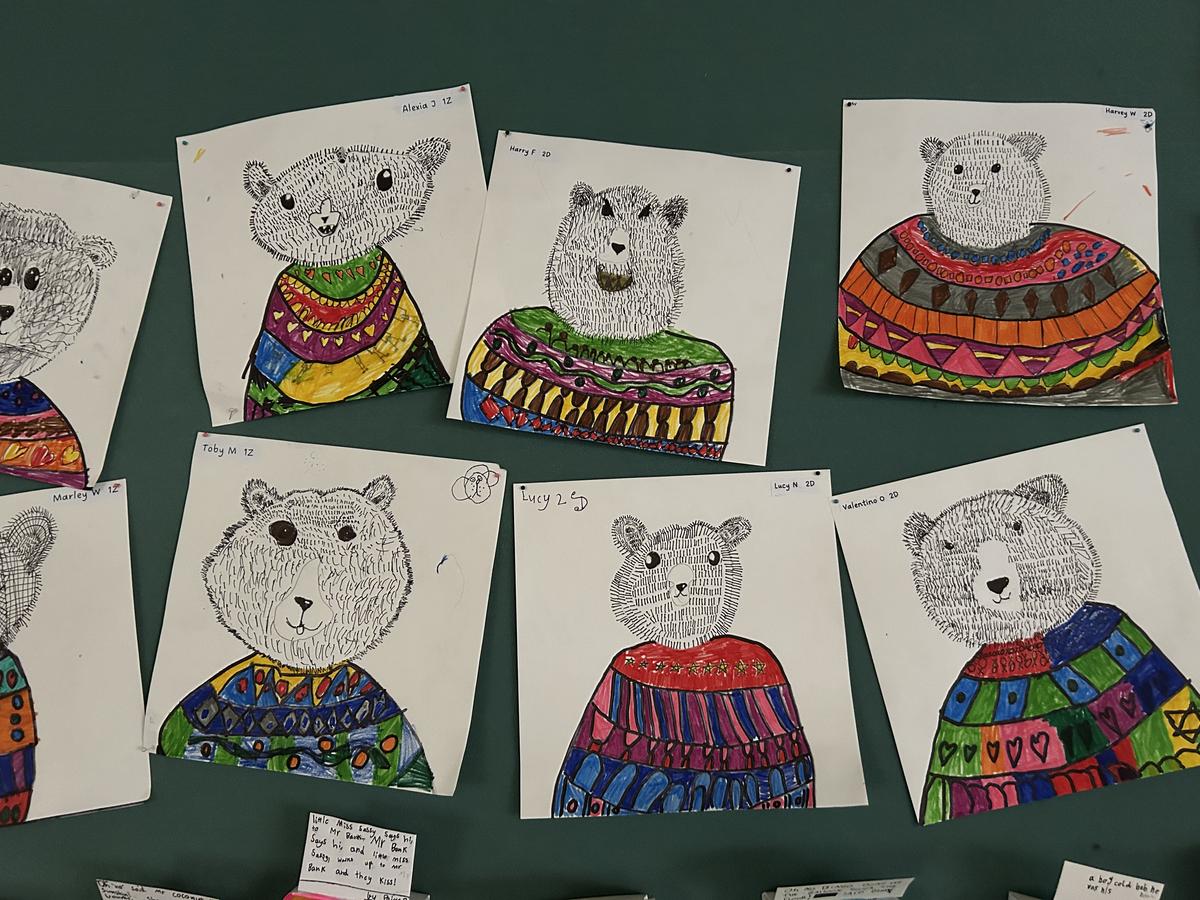 Students in prep drew polar bears, and painted their background with food dye and salt. After they brushed on the food dye, they sprinkled salt over it. They discovered the salt absorbed the water, which left interesting patterns. Students in grades 1 and 2 drew bears in winter sweaters, with a focus on line and pattern.