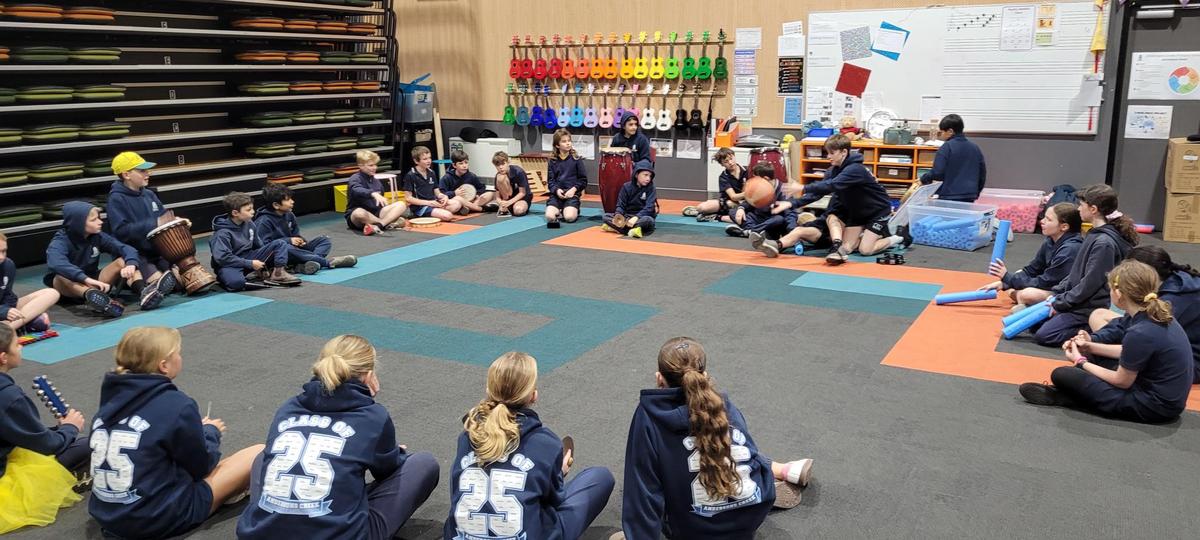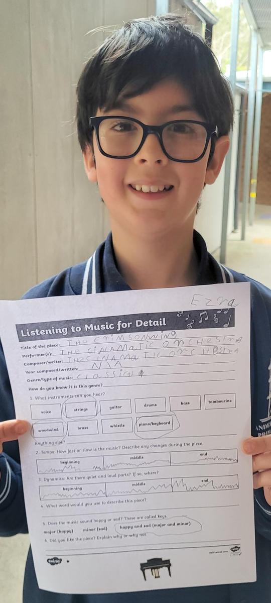 Grade 3-6 students have been warming up in lessons by tuning their visual and listening skills to compose music to match movements of a sports ball. In age appropriate detail, we have been exploring how different elements of music (eg. tempo, dynamics, pitch) are used to communicate ideas and purpose in music we listen to. Students are learning about orchestral instrument families and identifying when the families (string, woodwind, brass, percussion) feature in songs we listen to. We also discuss our preferences about each piece: