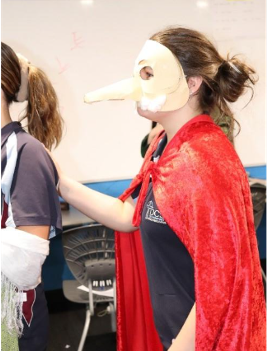 In class, students have explored the stock characters such as Arlecchino, Pantalone, el Capitano and Colombina, learning how each role uses unique physicality, voice, and improvisation to tell stories. They have also experimented with making their own masks, manipulating stagecraft, and the art of physical comedy, in creating their own ‘Confusing Tale of Chaos’ performances.