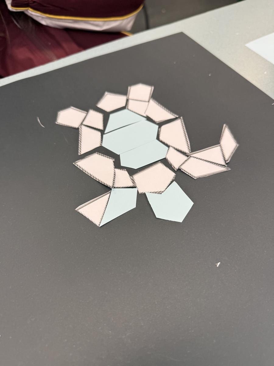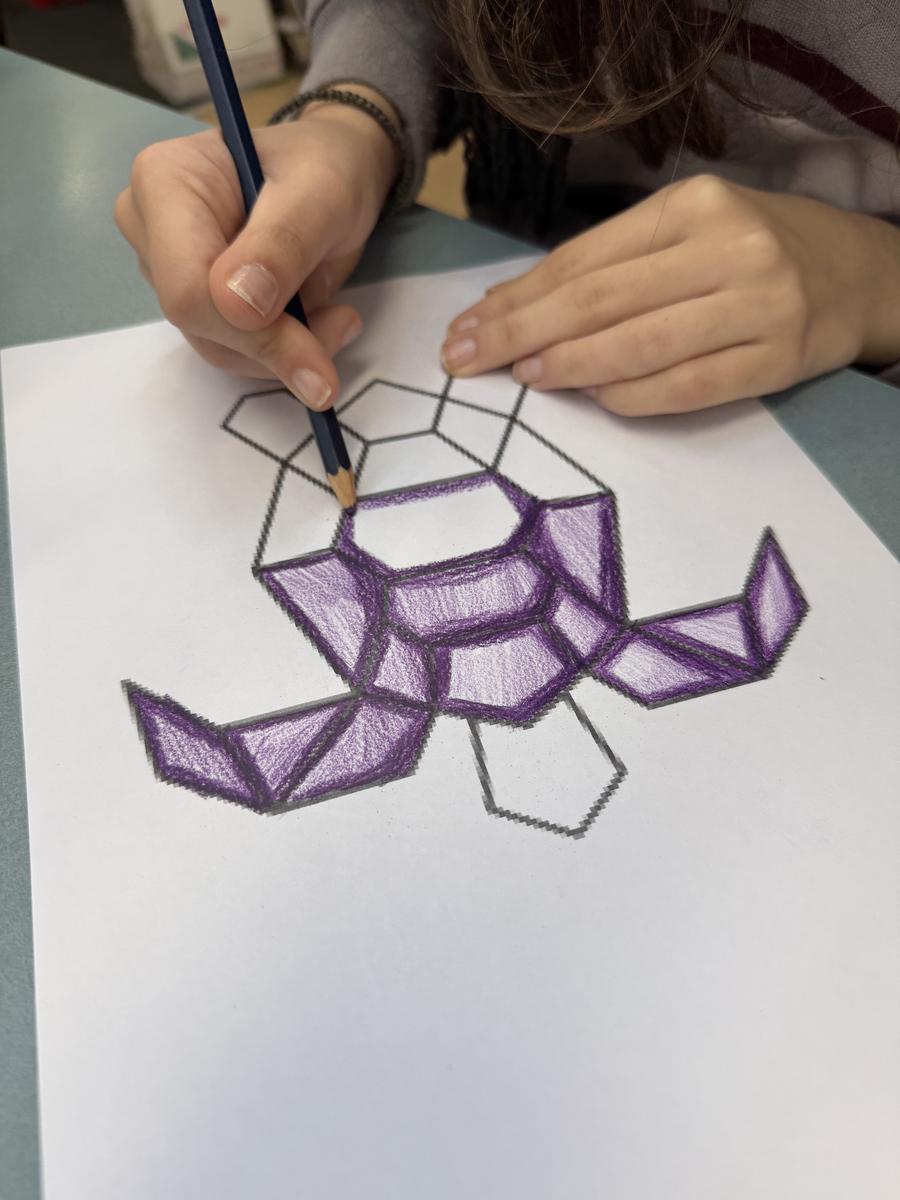 The Year 9 2D Art students are exploring monochromatic geometric animals and collaging. Here is an example of them developing their skills, using manual and digital methods of a turtle design.