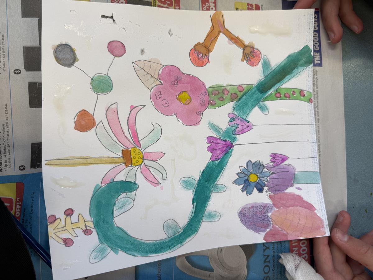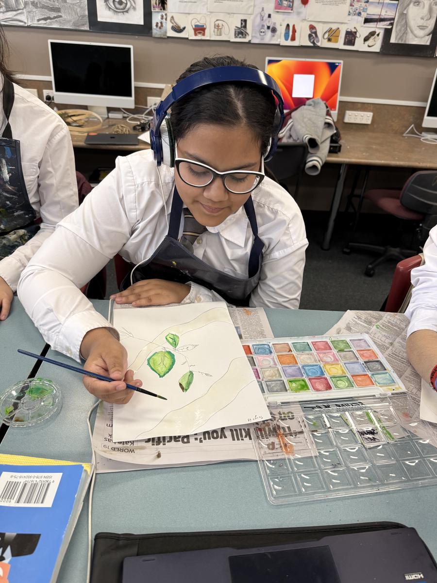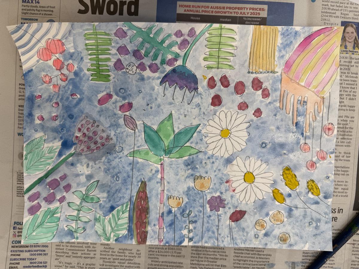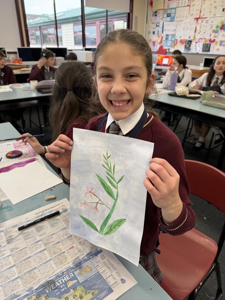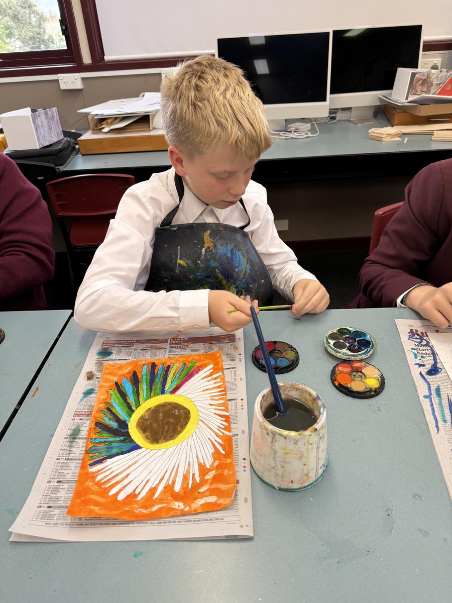 The Year 6 Visual Art students are using water colouring techniques to create a painting inspired by Bernadette Tomwey’s artwork. Here is them working in class and some finished paintings below: