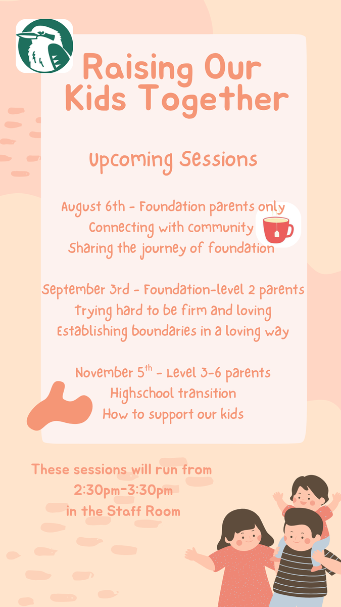 We are changing things up a little, to ensure that sessions best meet the needs of those attending. Due to a lack of time and the diversity of those attending we have decided to focus each session on a particular cohort of parents. This will ensure that parents with similar aged children can share and learn from each other around topics that are particularly relevant for the age/stage of their child/children. I have attached the schedule for the next 3 upcoming sessions which will be held in August, September and November.