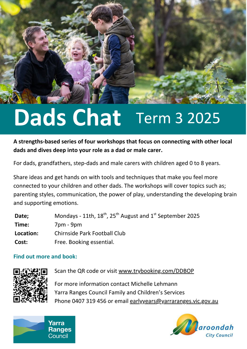 Term 3 Dads Chat is now open for booking. Maroondah and Yarra Ranges Councils will be hosting a strengths-based series of four workshops that focus on connecting with other local dads and dives deep into your role as a dad or male carer.