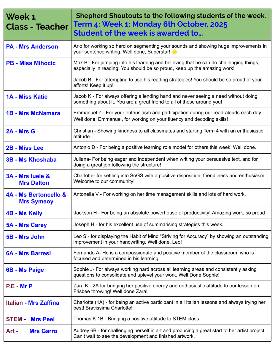 We are so excited to announce that Week 7 (17th-21st November) will be Italian Week at SoGS! As part of our Term 4 unit, "Together, We Belong", we will be celebrating the Italian culture and language along with other cultures that make up our vibrant community.
