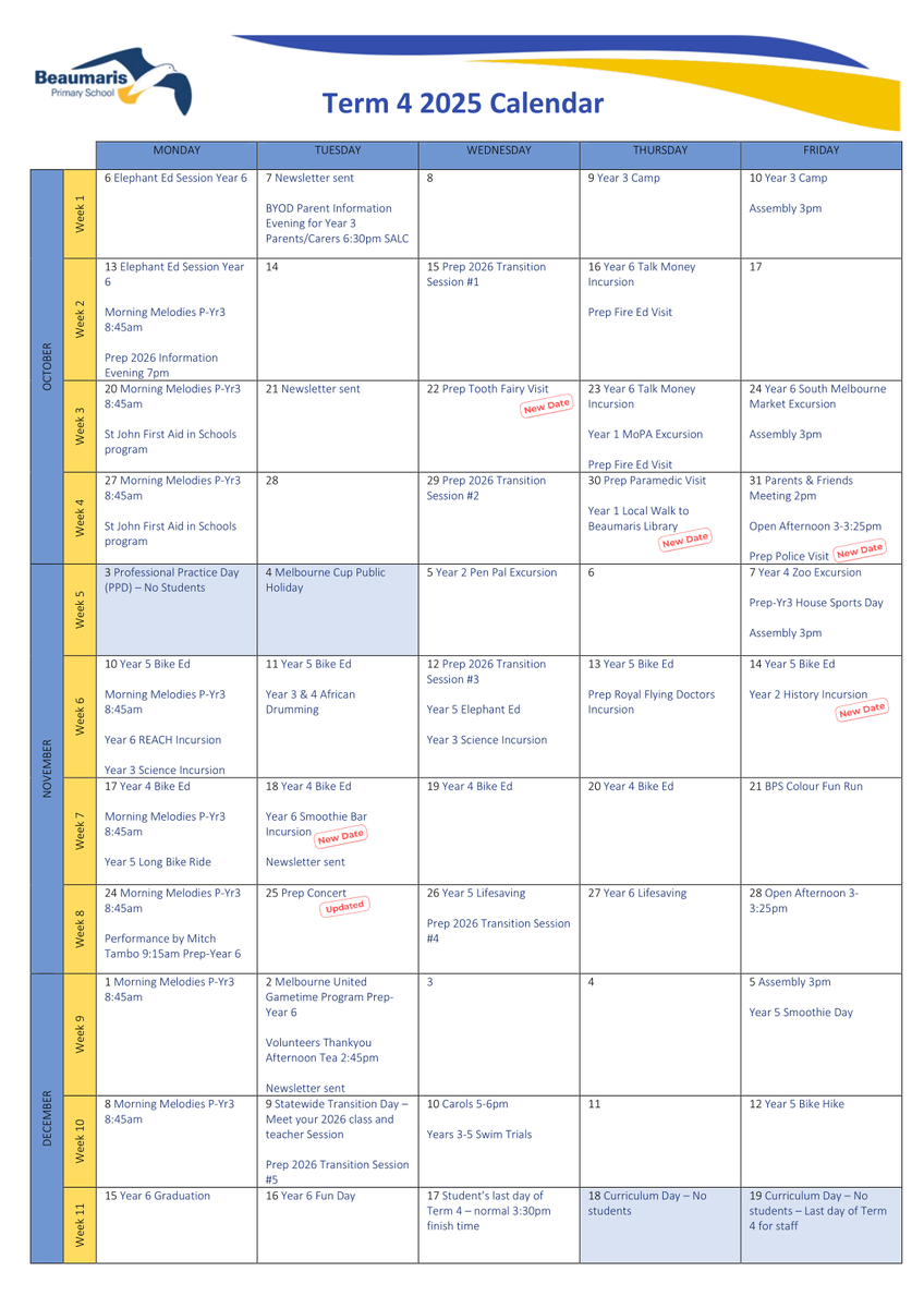 • Term 4: Monday 6th October to Friday 19th December (students last day is Wednesday 17th December - normal 3:30pm dismissal time)