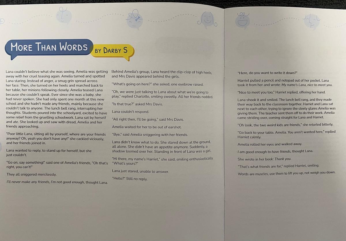 Billilla studio program artist and author Cassy Polimeni led workshops with 130 Year 5 students, where they created stories against bullying, culminating in an anthology of stories published in a series of five books. Their stories are aimed at inspiring fellow students, and our community, to speak up, find their voice, and support each other in the fight against bullying.
