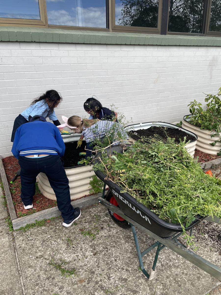 Last Thursday we were busy catching up on gardening after the holiday break. There were many plants that had finished producing vegetables and many plants that were not vegetables at all! We filled the wheelbarrow with weeds and dead plants and then we watered the plants that are still growing.