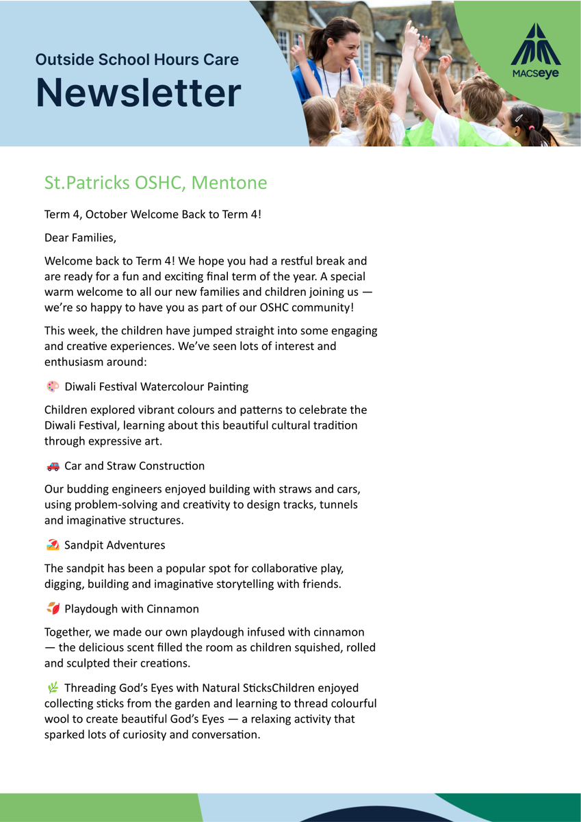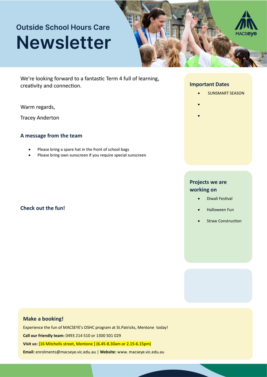 Out of School Hours Care (OSHC) is managed by MACSEYE, a subsidiary of Melbourne Archdiocese Catholic Schools (MACS).