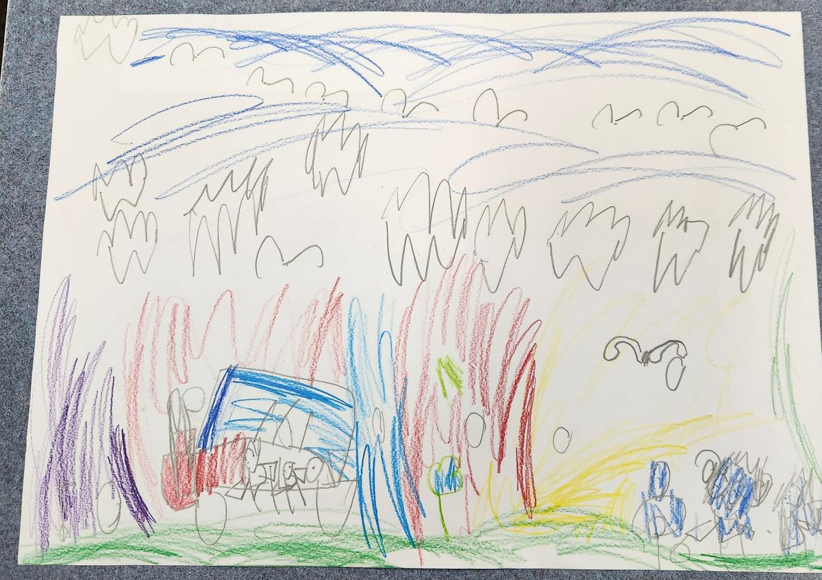 I did drawings of Minecraft. I did drawings of Jason Momoa and Steve. I drew it in the movie room.