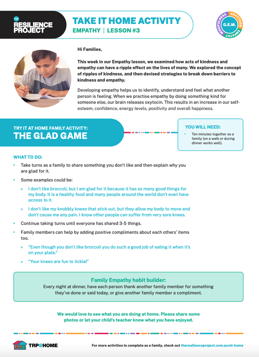 This week we are connecting families to our Resilience Project take home activities. These will be available in the newsletter twice a term and will link to what students are learning in the classroom!