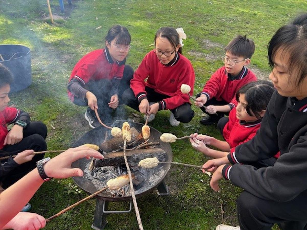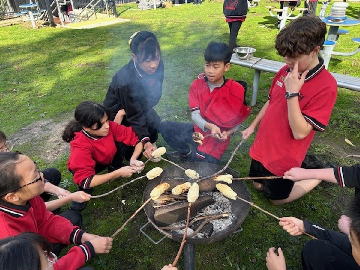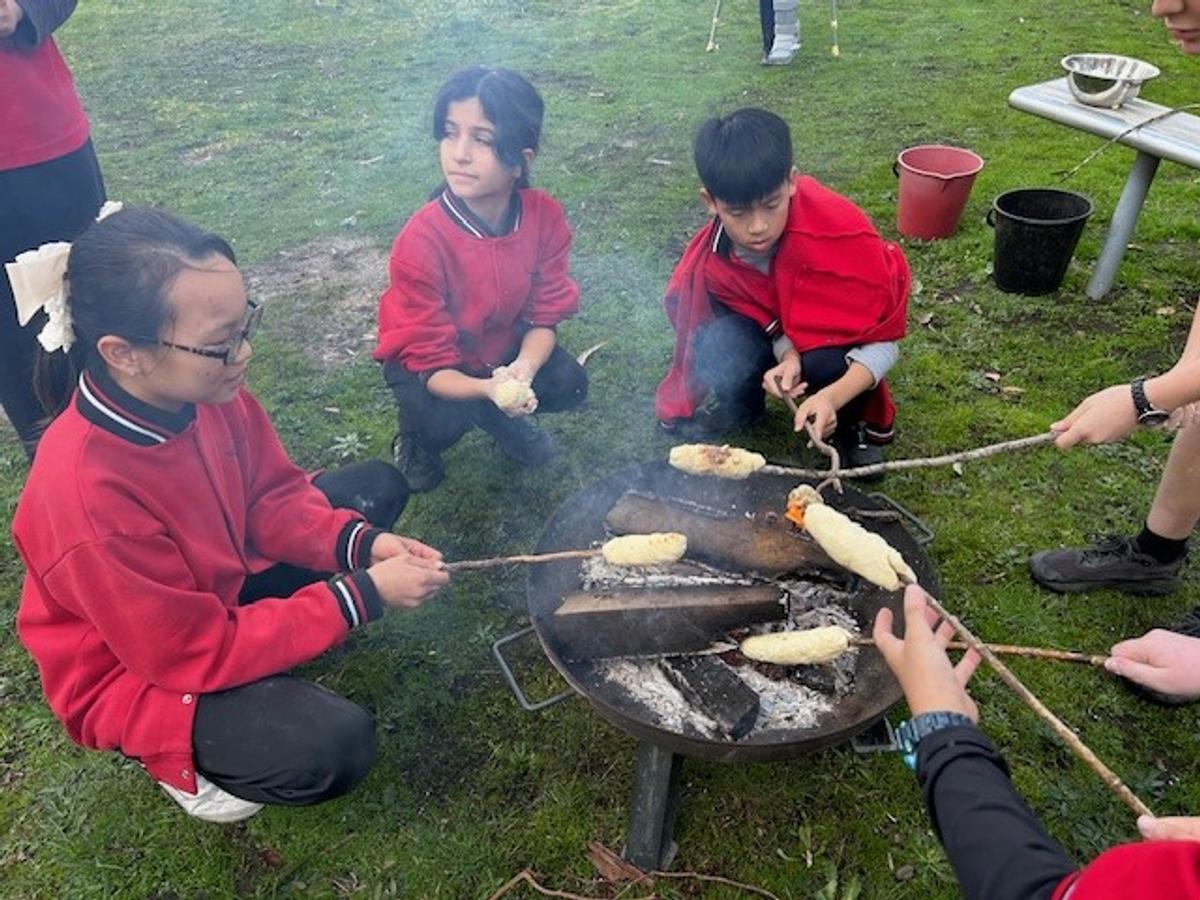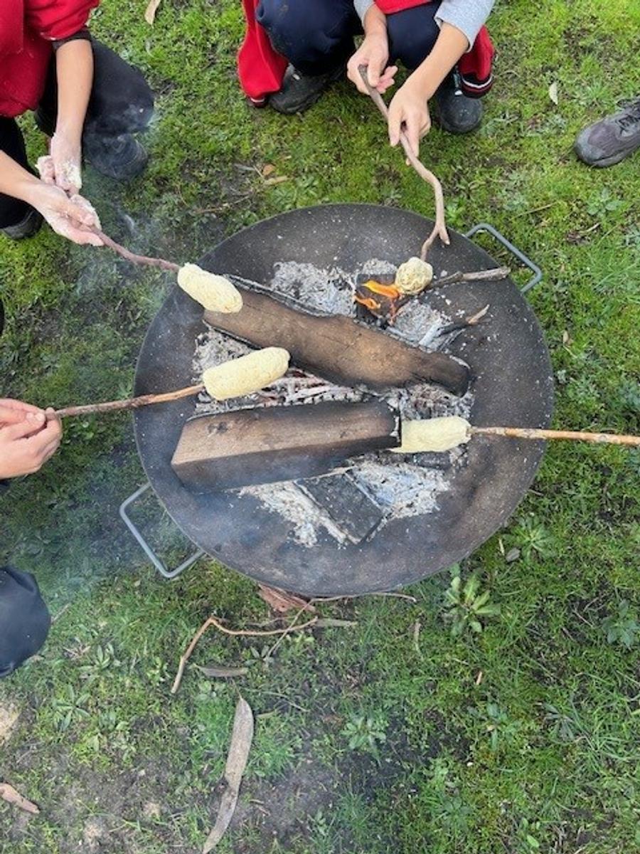 Grade 5/6 students gathered around the campfire and shelter cooking damper over the open fire.