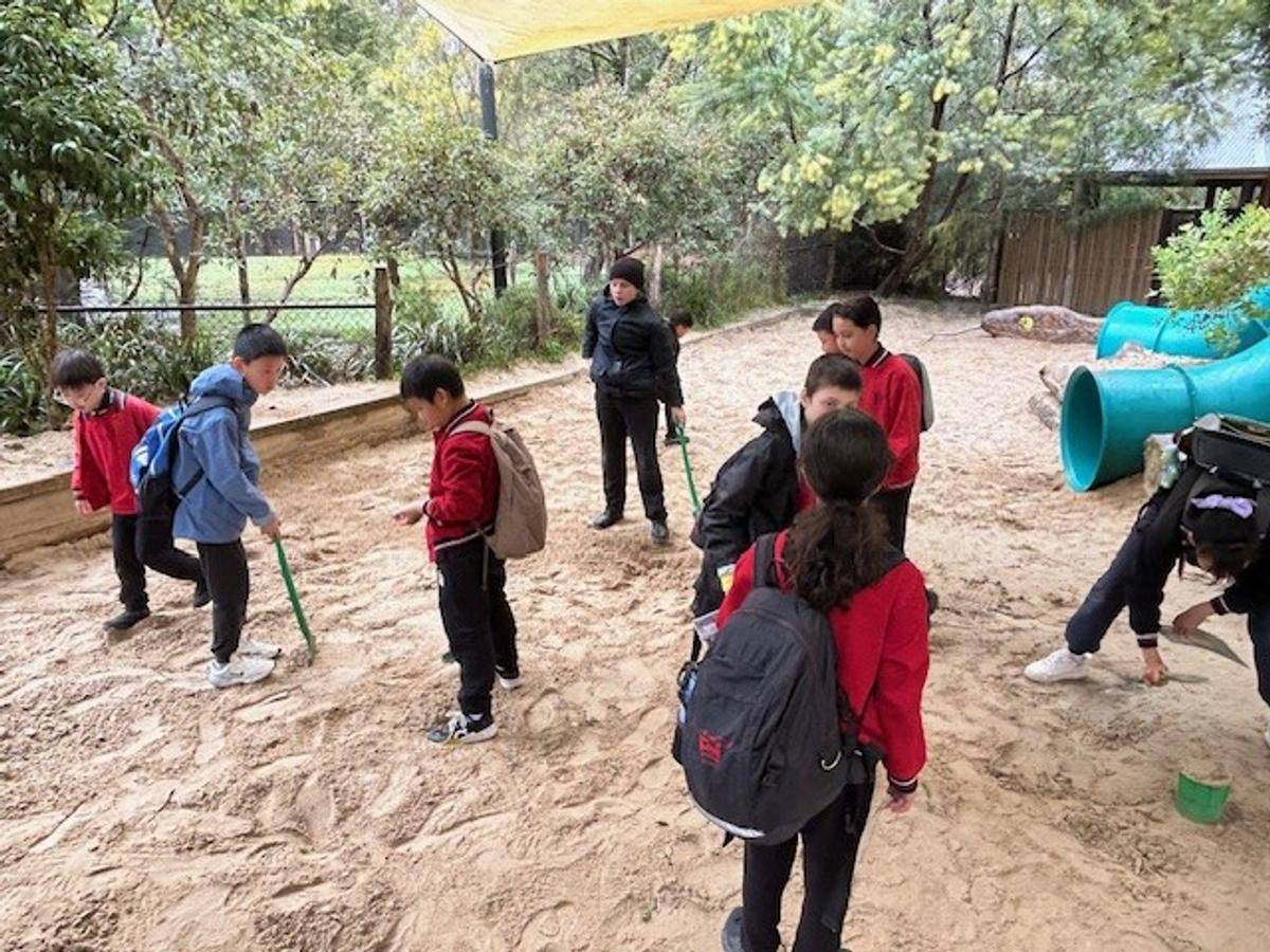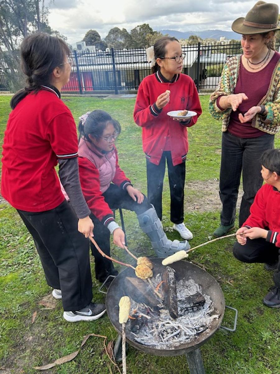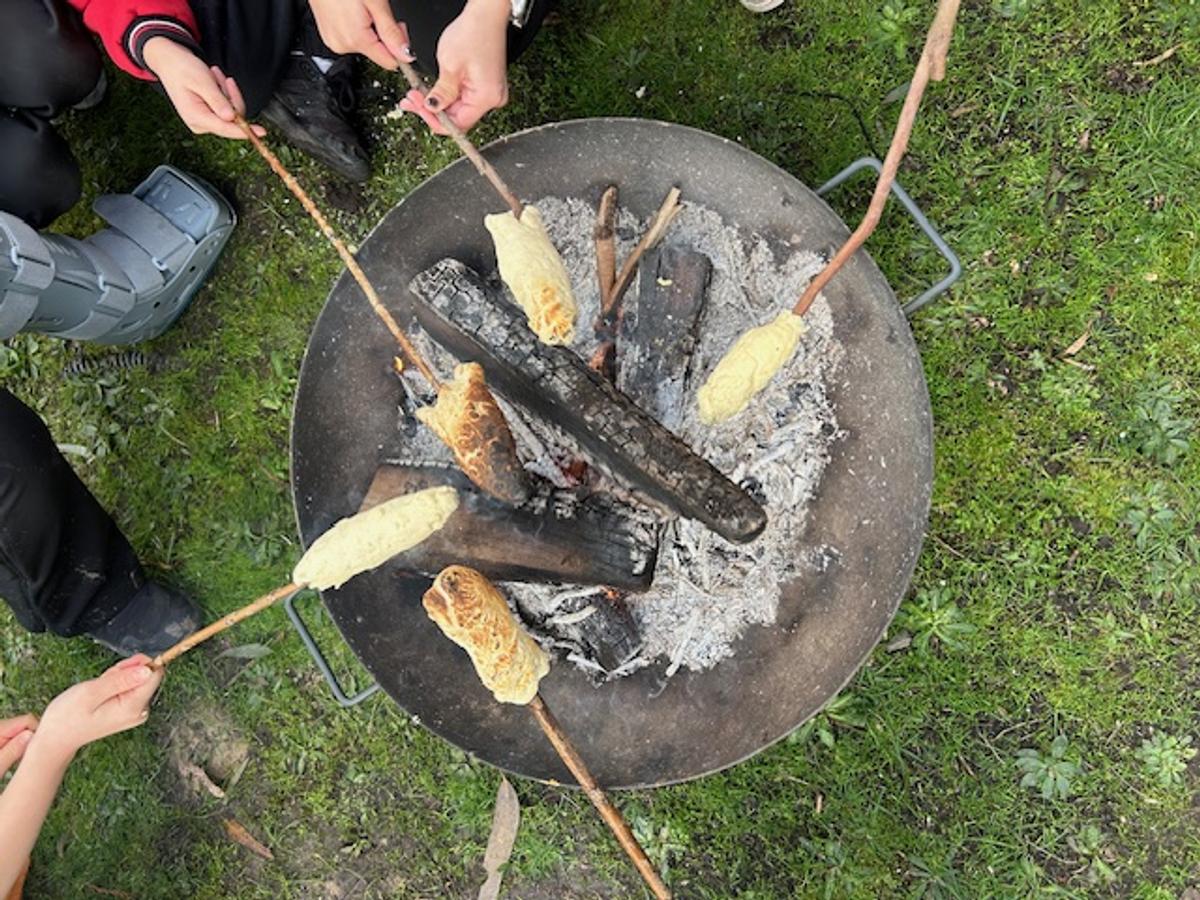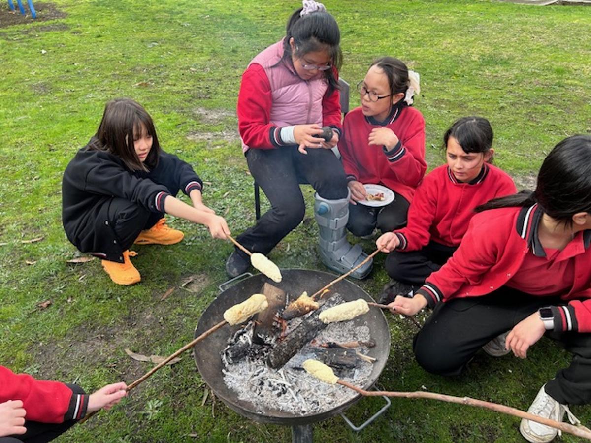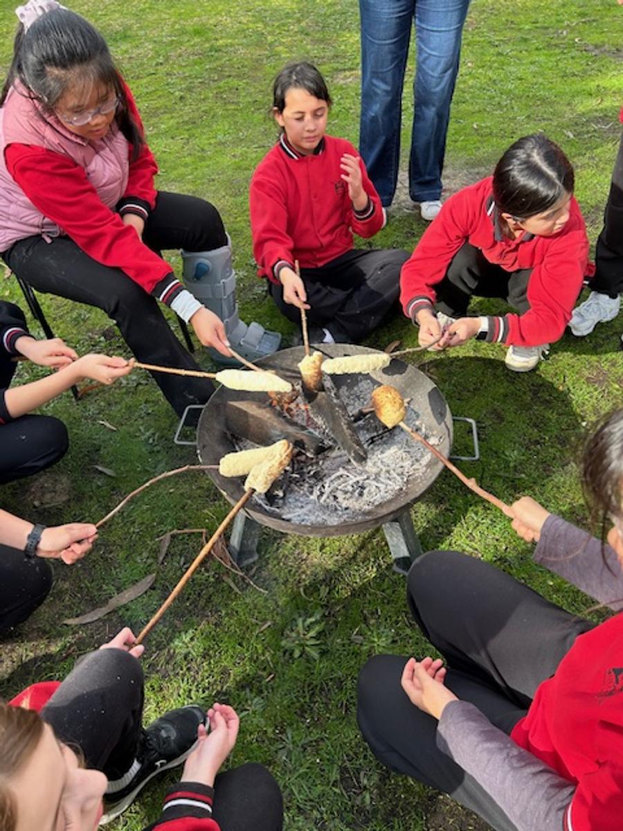 Grade 5/6 students gathered around the campfire and shelter cooking damper over the open fire.